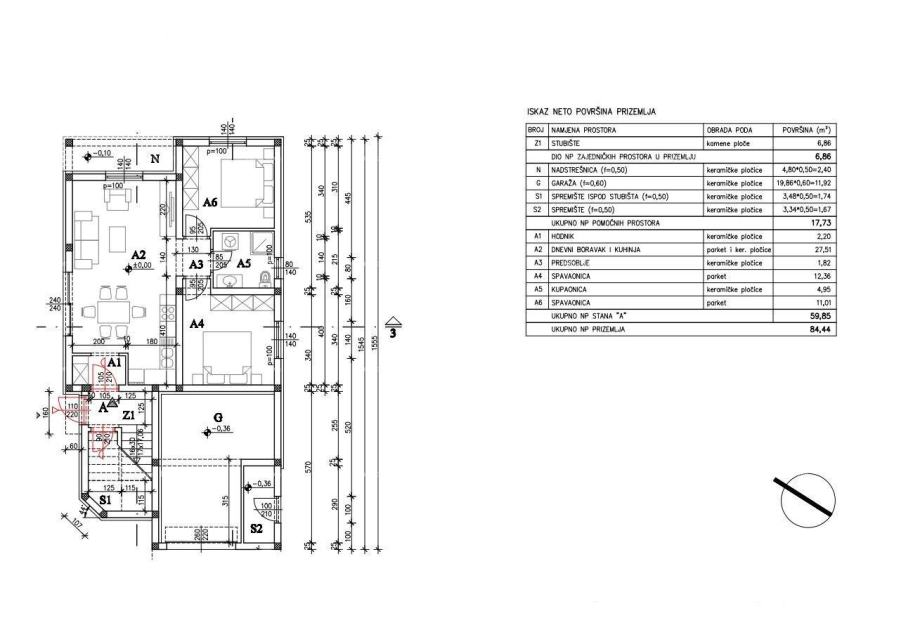 Ukupna netto površina stana "A" je 62.25 m2, pa stanu pripada i vrt.
