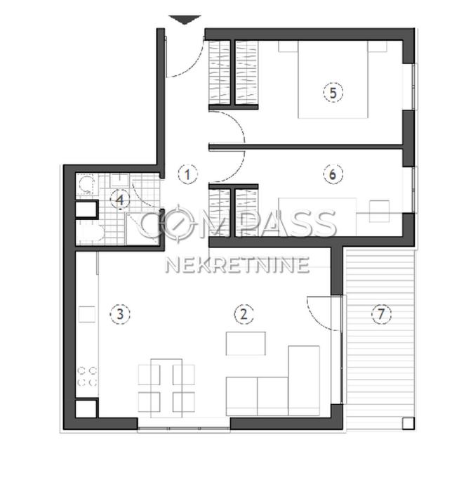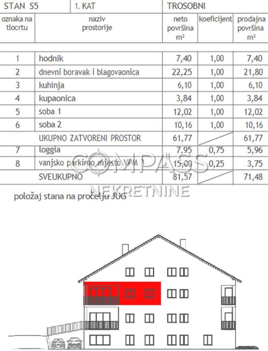 Hodnik 7,40 m² | Dnevni boravak i blagovaonica 22,25 m² | Kuhinja 6,10 m² | Kupaonica 3,84 m² | Soba 1 12,02 m² | Soba 2 10,16 m² | Loggia 7,95 m²
