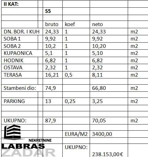 Površina stana S5 iznosi 66,80 m2, dok je ukupna netto s pripadcima (parking) 70,05 m2.