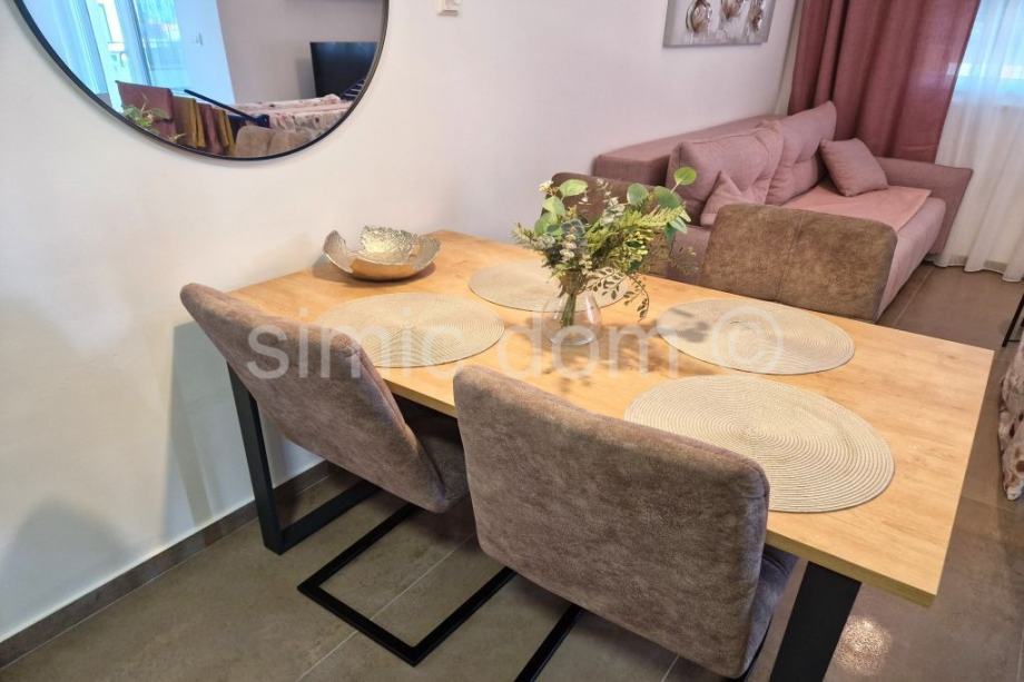 Na prodaju je odličan useljivi apartman smješten u novijoj, modernoj stambenoj zgradi, 200 metara od mora i nekoliko minuta hoda do najbliže plaže. Dovršena 2021. godine. Apartman se nalazi na prvom katu te ima ukupnu korisnu površinu od 55,86 m2, što uključuje 47 m2 unutarnjeg prostora i 9 m2 natkrivene terase. A pripada mu i vanjsko parkirno mjesto. Zajedno s pripatcima apartman ima neto korisnu površinu od oko 53 m2. Sastoji se od dnevnog boravka otvorenog koncepta s kuhinjom i blagovaonicom, dvije spavaće sobe, kupaonice i terase. Apartman je izrazito lijepo uređen, odličnog je rasporeda i odmah je useljiv. Namještaj i oprema uključeni su u cijenu. Atraktivna lokacija čine ga odličnim izborom za one koji traže ugodan životni prostor, bilo kao stalno prebivalište ili nekretninu za odmor. Vlasništvo uredno.