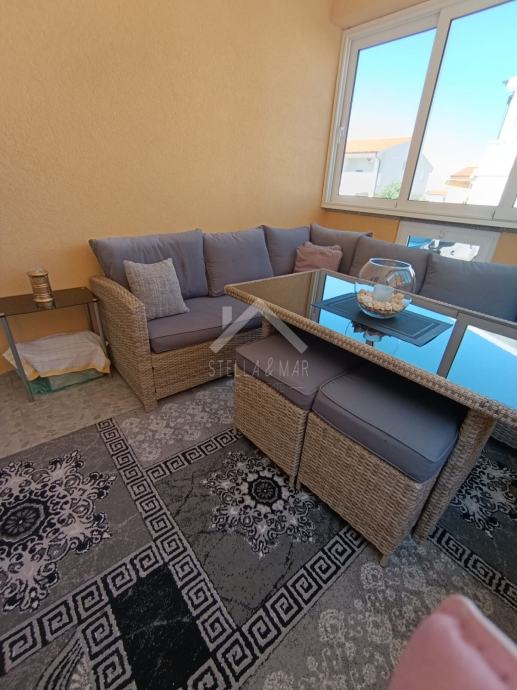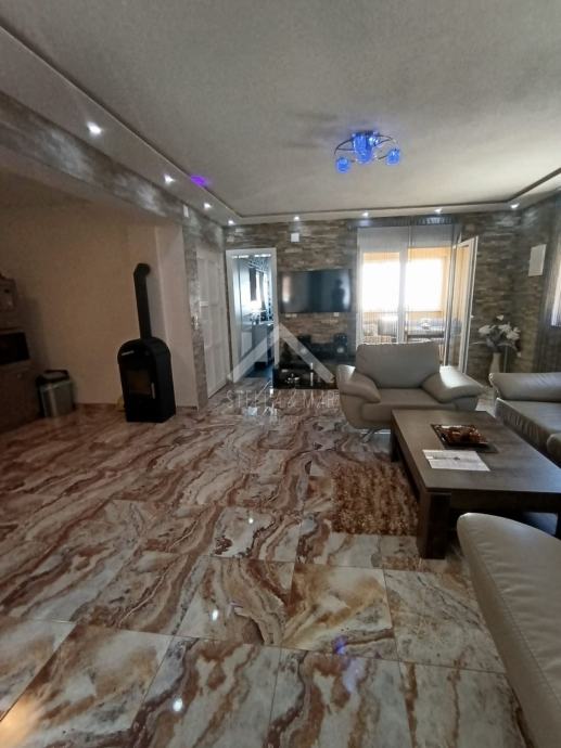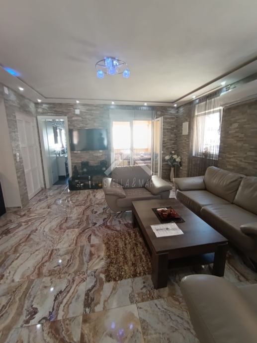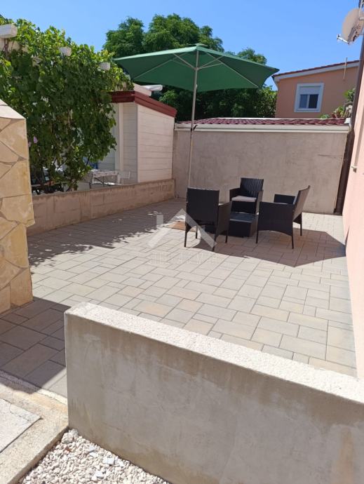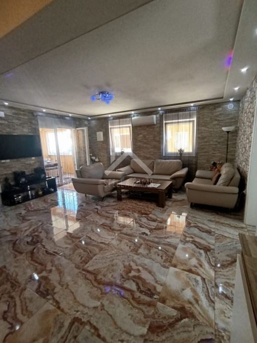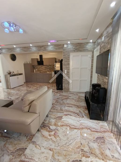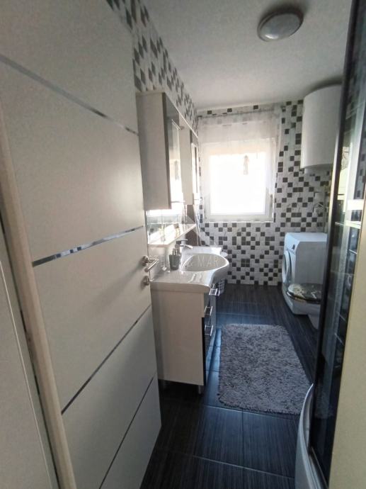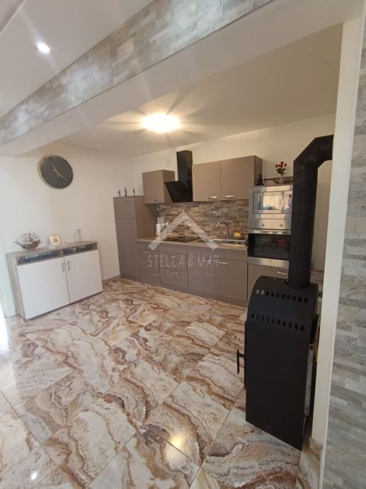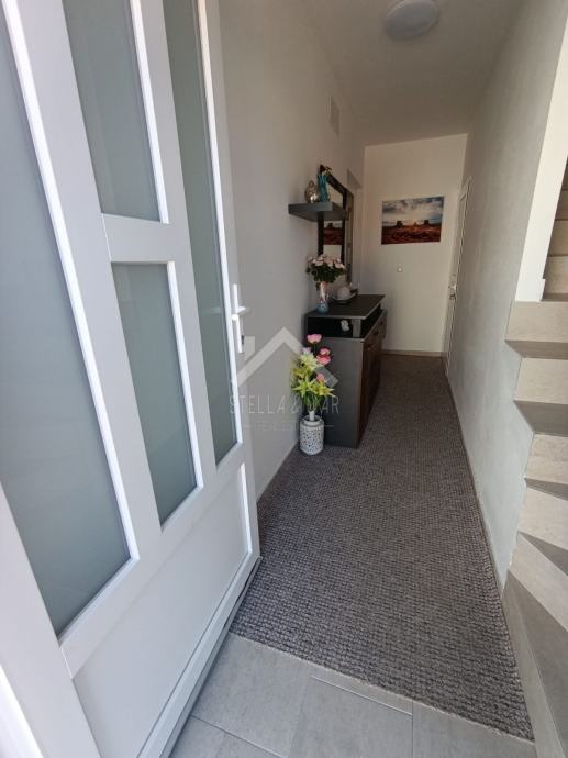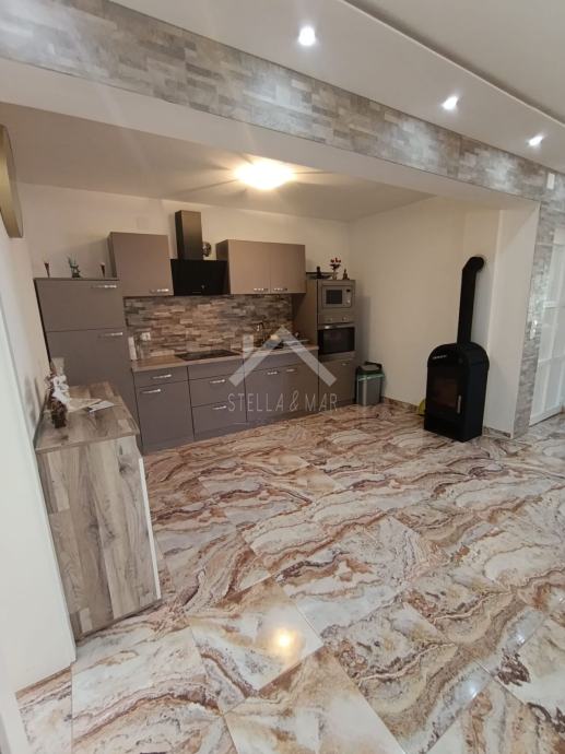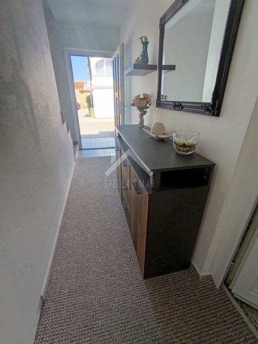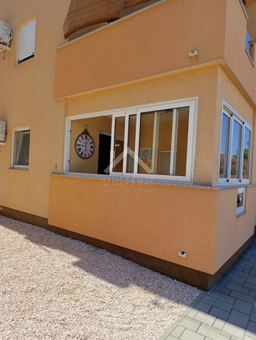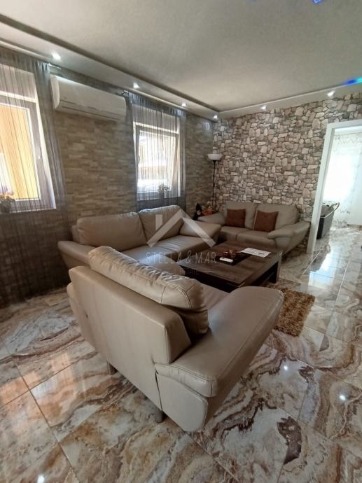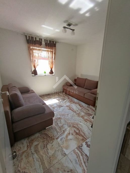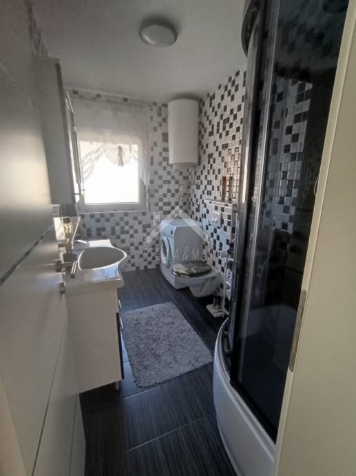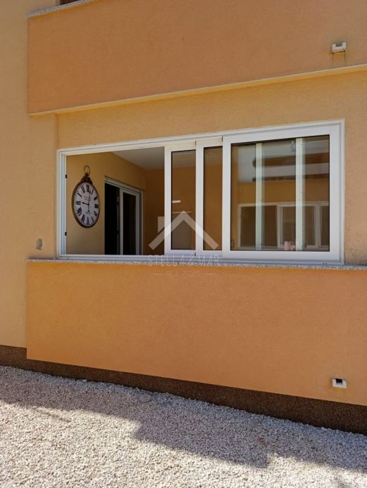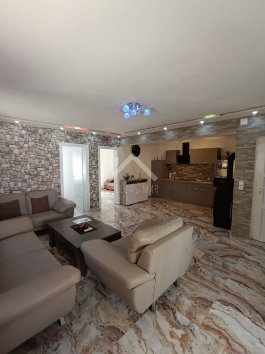 Apartman se nalazi u Prizemlju zgrade sa ukupno 4 apartmanske jedinice . Raspolaže sa dnevnim boravkom, kuhinjom, blagovaonom, svije spavaće sobe , kupaonom i zatvorenom terasom. Apartmanu pripada dio vrta te jedno parkirno mjesto. Posjeduje cisternu od 5m3 . Odvojeno brojilo za struju.