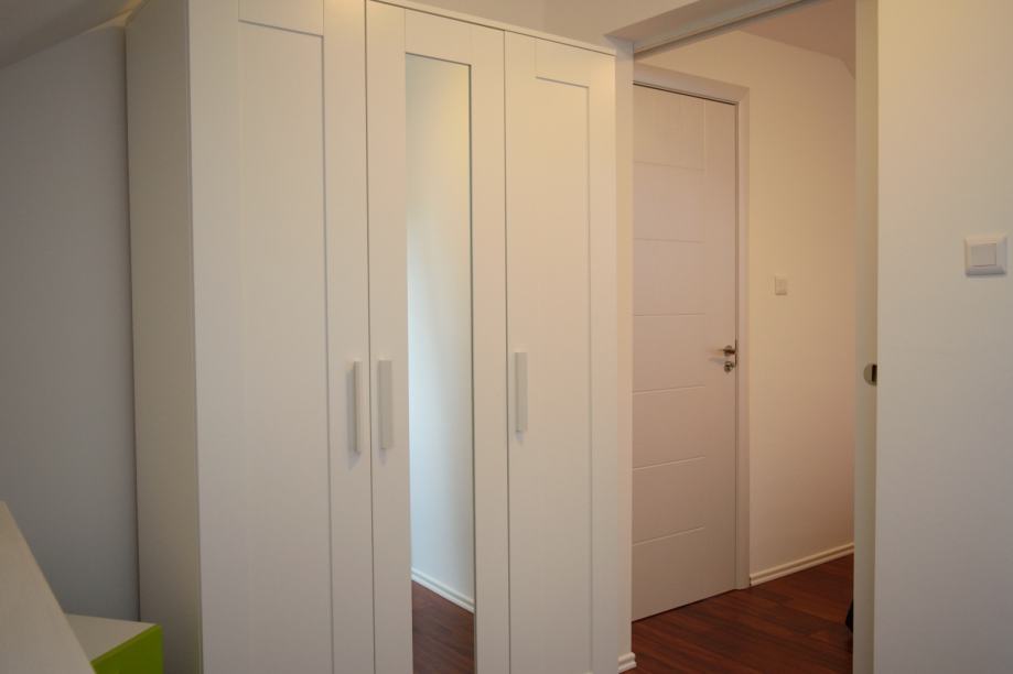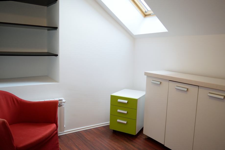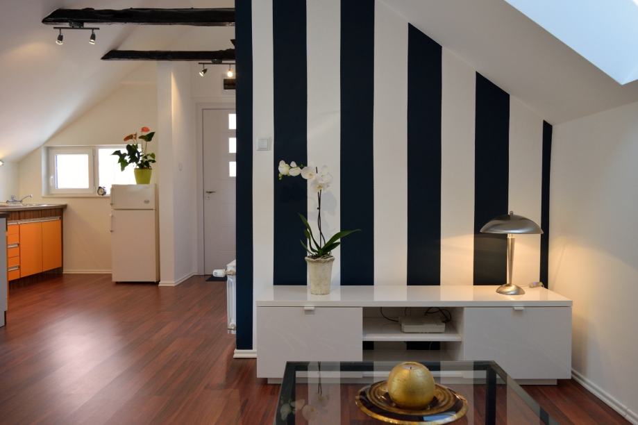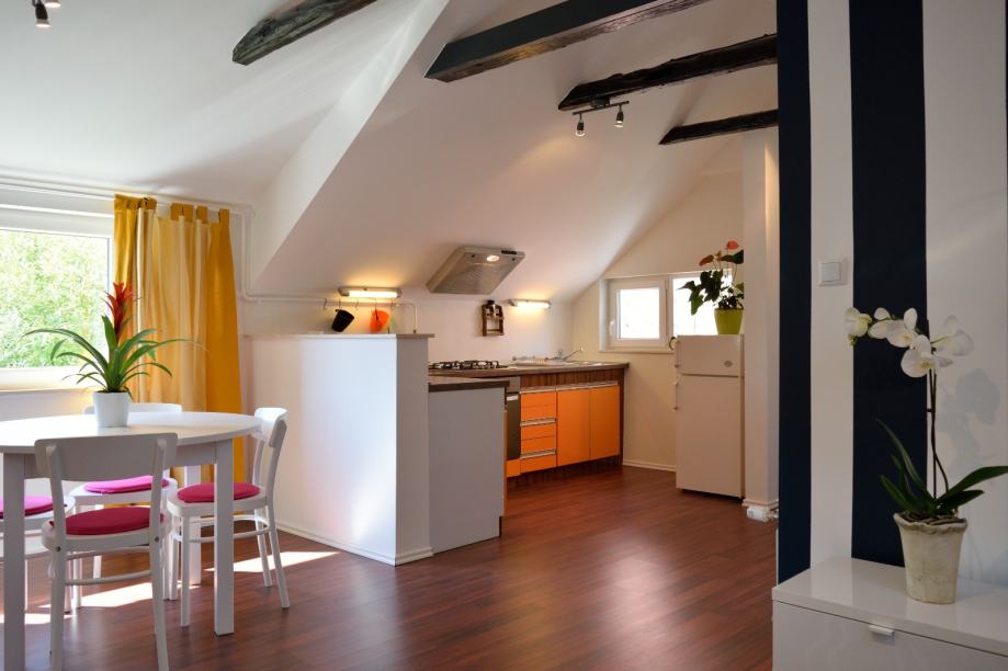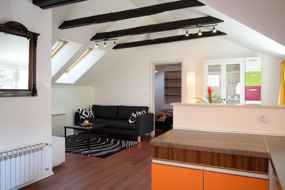 Kompletno renoviran (2015.), od 49 m2 u Mlinovima. Stan se nalazi u otvorenom visokom pokrovlju s vidljivim drvenim gredama, a sastoji se od dnevne i spavaće sobe, jedne manje sobe (garderoba ili radna), hodnika,kuhinje u zasebnom dijelu otvorenog dnevnog boravka, kupaonice s WC. Korištenje lijepo uređenog dvorišta i parkirnog mjesta.