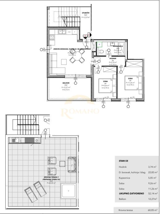 Na prodaju je stan na drugom katu ukupne površine od 64 m2 (52 m2 stan i 12 m2 natkrivena terasa + krovna terasa 60 m2).