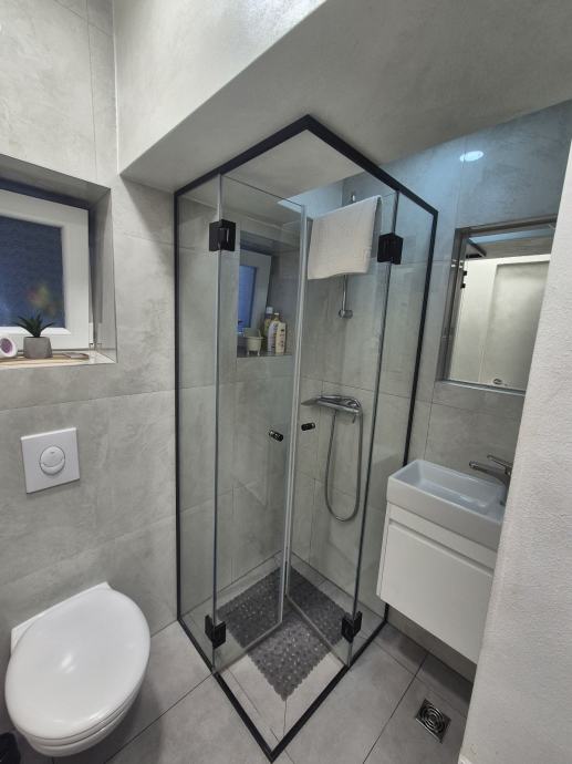 Stan se sastoji od ulaznog hodnika, spavaće sobe, dnevnog boravka s blagovaonicom, kuhinje s izlazom na ograđeni vrt/terasu površine cca 20 m² te kupaonice s WC-om. Vrt odnosno terasa nije upisana u zemljišne knjige, ali je u isključivom i dugogodišnjem korištenju isključivo ovog stana. Upravo taj vanjski prostor daje nekretnini veliku dodanu vrijednost, rijetku za ovu lokaciju.