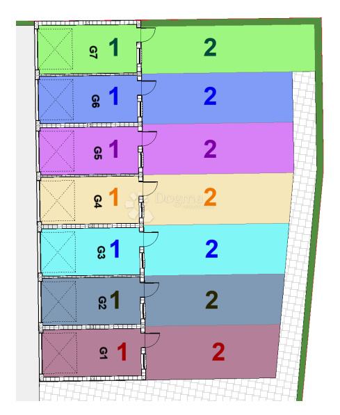Zgrada će imati ukupno 7 stanova raspoređenih na tri kata. U dvorištu će biti dostupno 5 vanjskih parkirnih mjesta te 7 garaža s vlastitim vrtom, koje se kupuju odvojeno od stana.