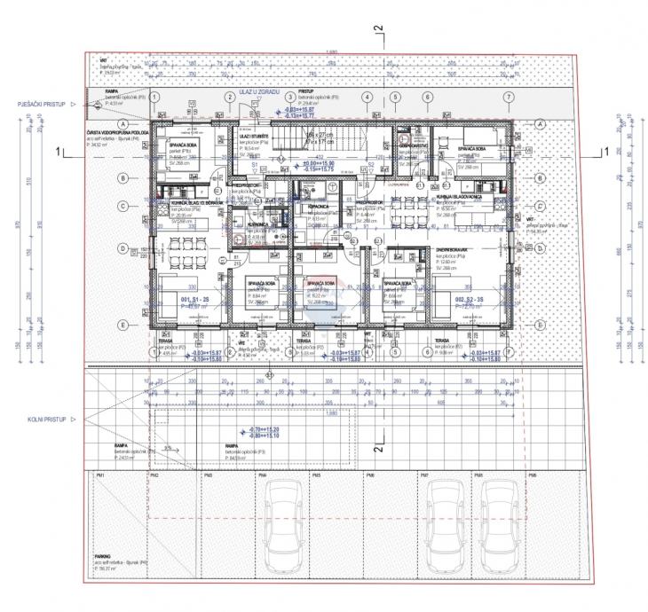 Ukupna zatvorena površina stana iznosi 45,67 m2. Iz dnevnog boravka pristupa se terasi površine 4,95 m2 (2,48 m2 neto) i privatnom dijelu vrta površine 30 m2 (3m2 neto). U dogovoru s investitorom u vrtu je moguće postaviti roštilj, prostor za sjedenje i sl.