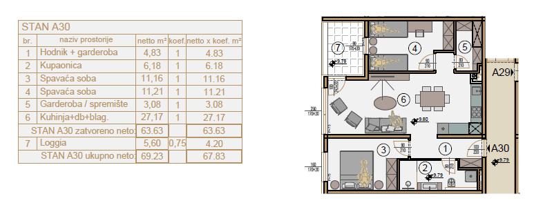 Stan ukupne površine 67,83 m² sastoji se od ulaznog hodnika s garderobnim prostorom, otvorenog koncepta kuhinje, dnevnog boravka i blagovaonice, dvije spavaće sobe, ostave te moderne kupaonice. Posebnu vrijednost daje loggia, idealna za boravak tijekom cijele godine. Stanu pripadaju i dva garažna mjesta smještena u podzemnoj etaži zgrade.
