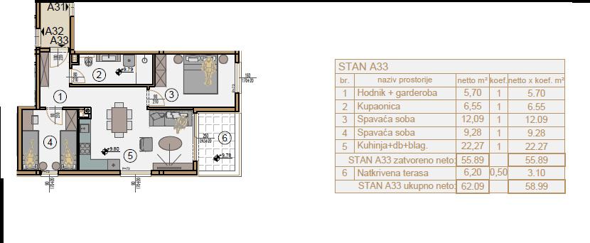 Stan ukupne površine 58,99 m² sastoji se od ulaznog hodnika s garderobnim prostorom, otvorenog koncepta kuhinje, dnevnog boravka i blagovaonice, dvije spavaće sobe te moderne kupaonice. Posebnu vrijednost daje natkrivena terasa, idealna za boravak tijekom cijele godine. Stanu pripada i garažno mjesto smješteno u podzemnoj etaži zgrade.