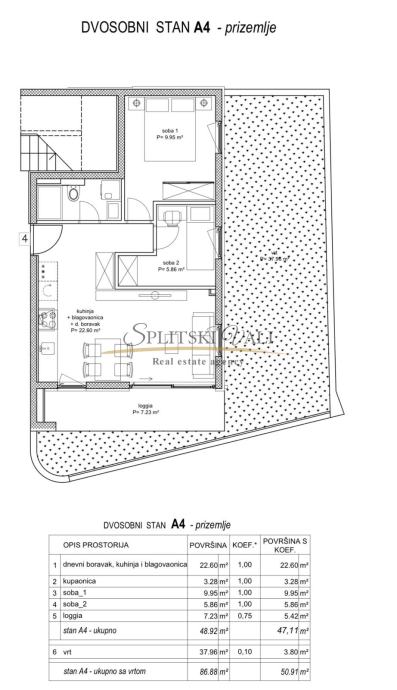 Dvosobni stan u prizemlju ukupne podne površine 47,11 m² a sastoji se od dnevnog boravka, kuhinje s blagavaonicom, dvije spavaće sobe, kupaonice, loggie (5.42m²) te vrta ( 37.96m²).