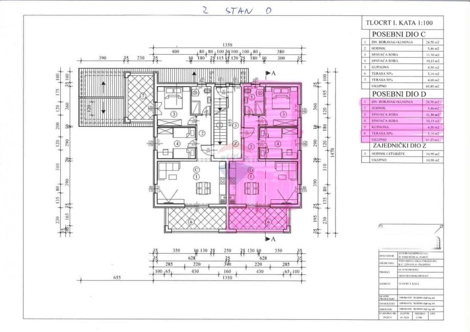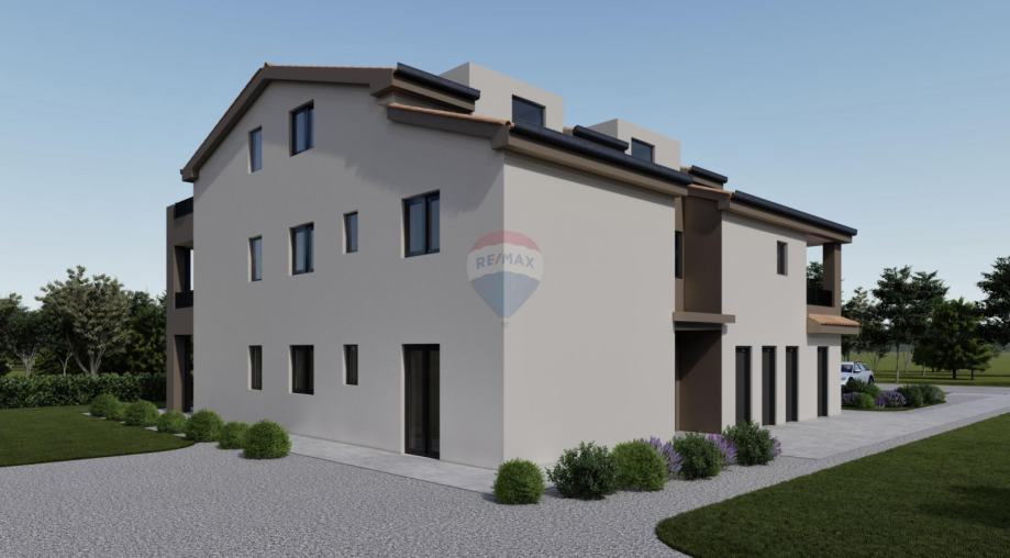 stan u novoizgrađenoj zgradi. Stan se sastoji od dnevnog boravka, kuhinje, blagovaone, dvije spavaće sobe, kupaonice i velike terase.
