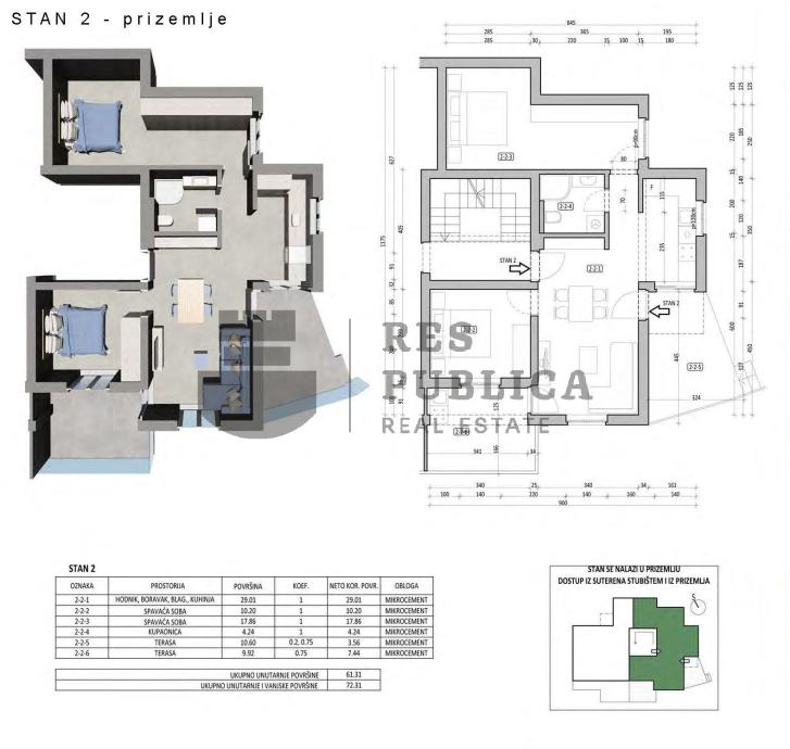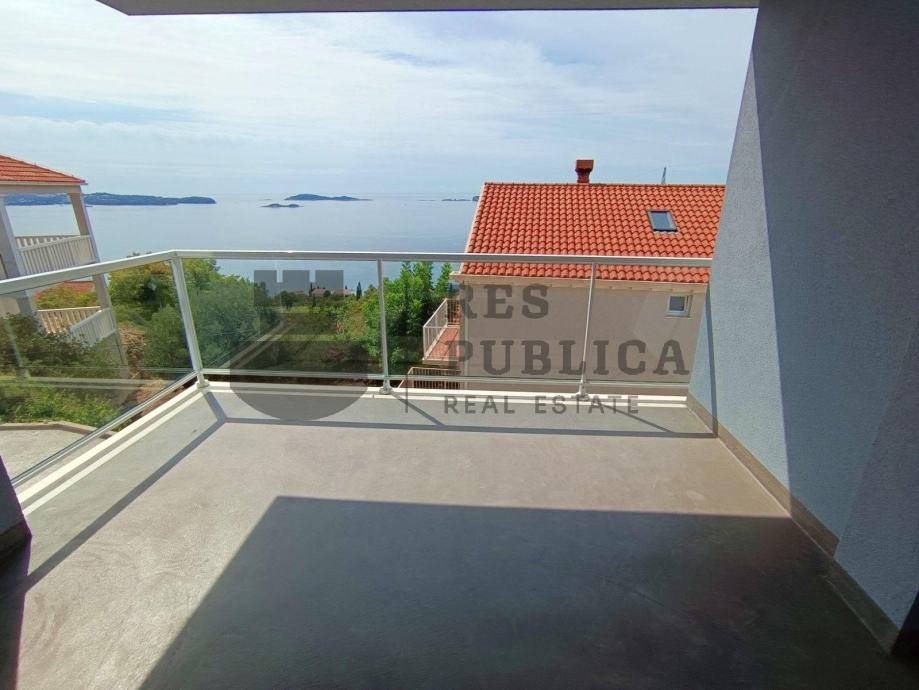 Ovaj dvosobni stan smješten je u prizemlju moderne stambene zgrade u Mlinima, malom ribarskom mjestu koje se nalazi između Dubrovnika i Cavtata. Stan ima ukupnu površinu od 74,81 m², s 61,31 m² stambene površine. Sastoji se od kuhinje, dnevnog boravka s blagovaonicom, dvije spavaće sobe, kupaonice te terasa, od kojih jedna nudi pogled na Cavtatski arhipelag i more. Stan također ima manju terasu.