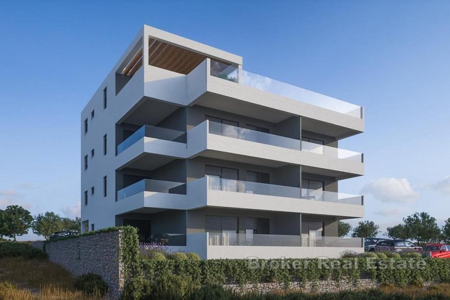 U neposrednoj blizini Trogira, u obiteljskom i turističkom naselju, u sklopu manje novogradnje prodaje se dvosoban stan s pogledom na more.