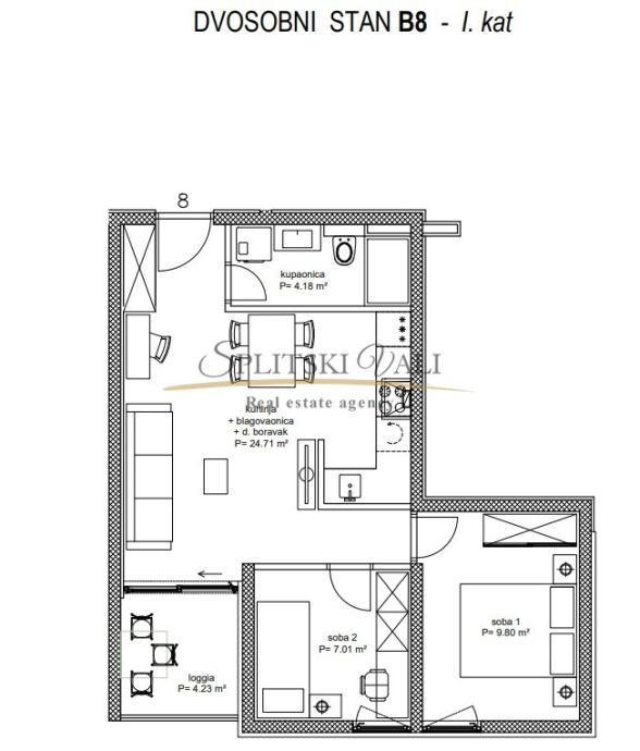 Stan se sastoji od dnevnog boravka s kuhinjom i blagovaonicom, dvije spavaće sobe, kupaonice i loggie površine 4,23 m². Ukupna obračunska površina iznosi 48,88 m². Tlocrt i detaljna specifikacija nalaze se u slikama oglasa.