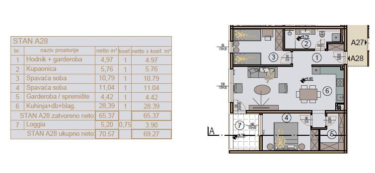 Stan ukupne površine 69,27 m² sastoji se od ulaznog hodnika s garderobnim prostorom, otvorenog koncepta kuhinje, dnevnog boravka i blagovaonice, dvije spavaće sobe, ostave te moderne kupaonice. Posebnu vrijednost daje loggia, idealna za boravak tijekom cijele godine. Stanu pripadaju i dva garažna mjesta smještena u podzemnoj etaži zgrade.