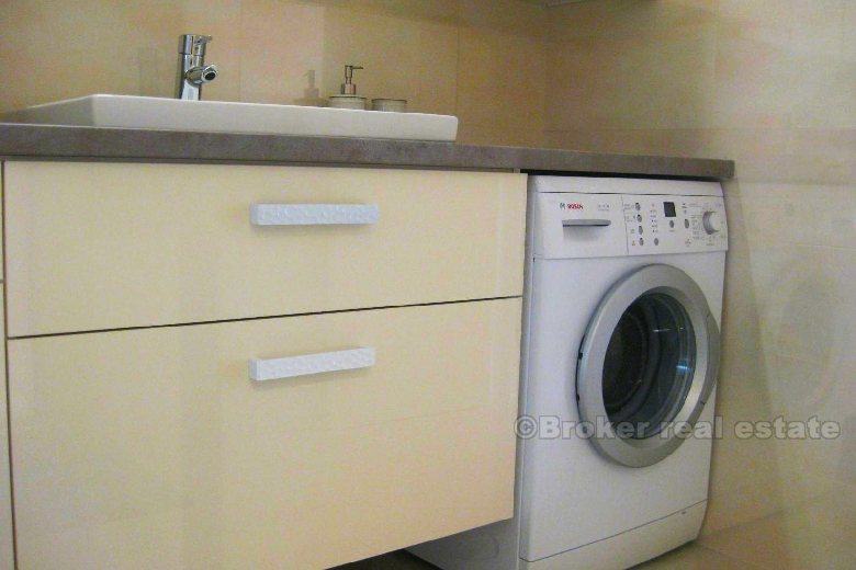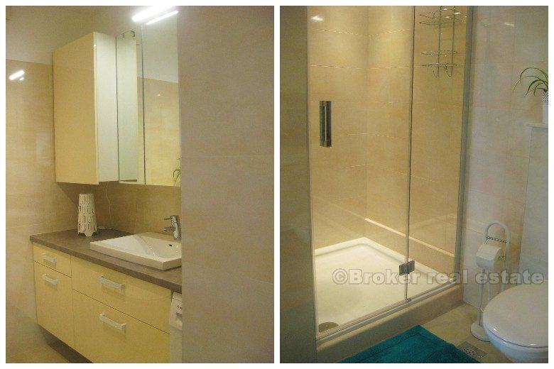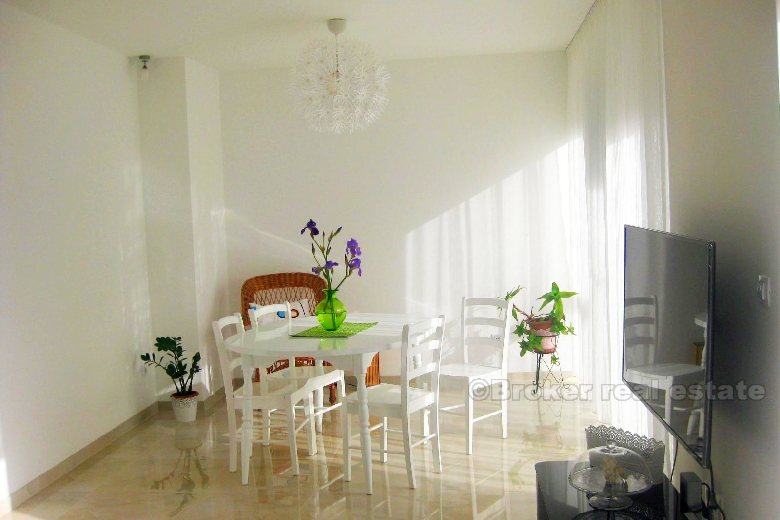 Prostrani stan od 90m2 nalazi se na mirnoj lokaciji u kvartu Meje, u blizini svih gradskih sadržaja, park šume Marjan i mora. Stan je u prizemlju manje obiteljske kuće od 4 kata (ukupno 8 stambenih jedinica). Sastoji se od ulaznog hodnika, wc-a, kupaonice, jedne bračne i jedne dvokrevetne sobe, te prostranog dnevnog boravka sa trpezarijom i kuhinjom. Ovaj “open space” prostor okrenut je prema jugu sa puno dnevnog svjetla. Stan je novouređen i opremljen vrhunskim namještajem. Stanu pripada i ograđeno parkirno mjesto. Režije nisu uključene u cijenu.