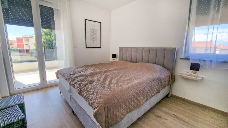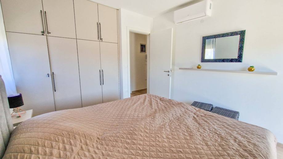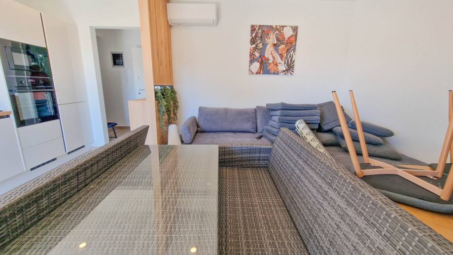 Stan se sastoji od prostranog dnevnog boravka s kuhinjom i blagovaonicom, velike terase s pogledom na more, dvije spavaće sobe, kupaonice i hodnika. U vlasništvu su i dva parkirna mjesta.