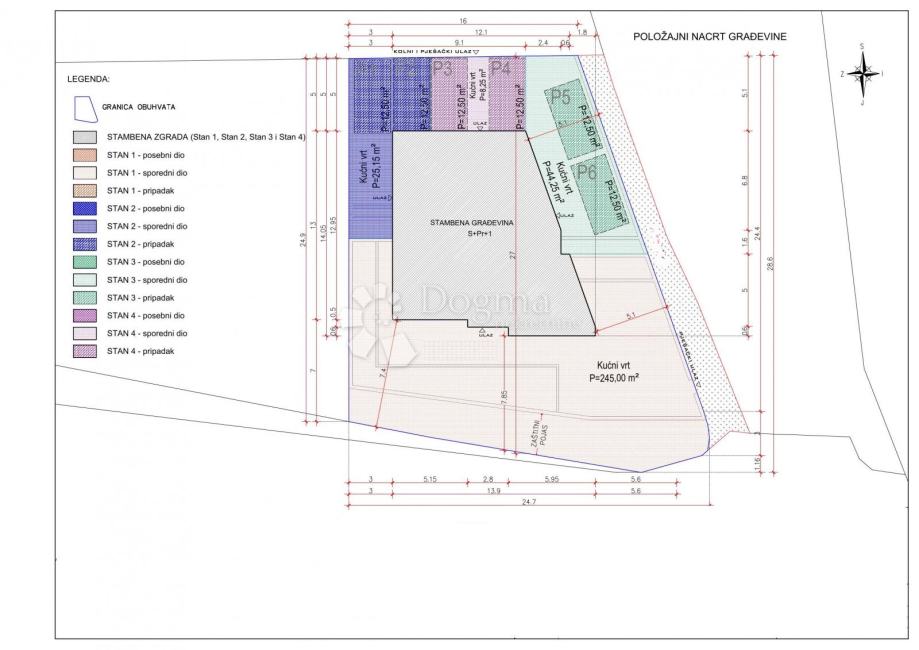 Zgrada se sastoji od ukupno četiri stana, od kojih svaki ima svoj zaseban ulaz, privatni vrt te dva parkirna mjesta.