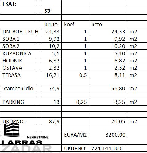 Površina stana S3 iznosi 66,80 m2, dok je ukupna netto s pripadcima (parking) 70,05 m2.