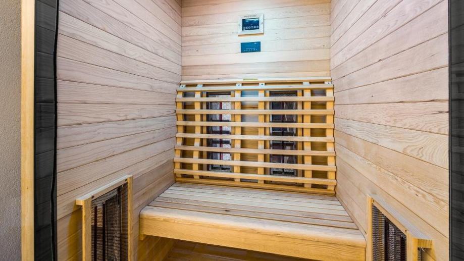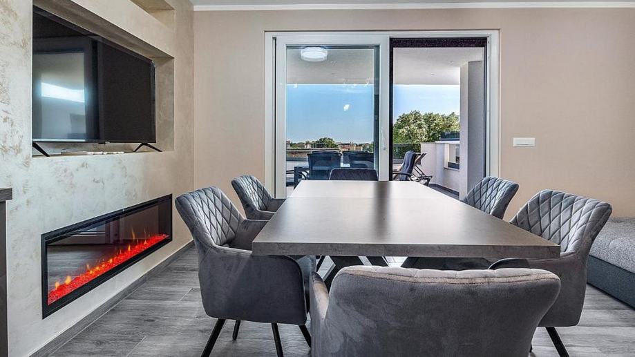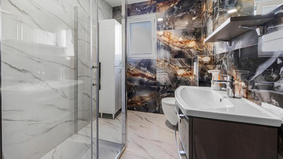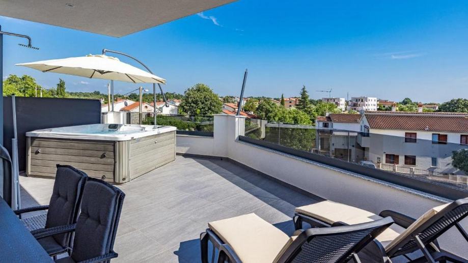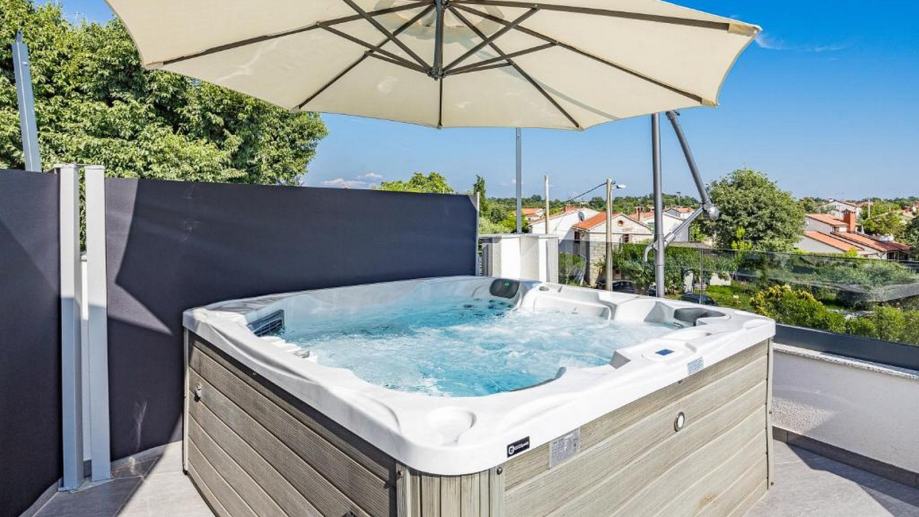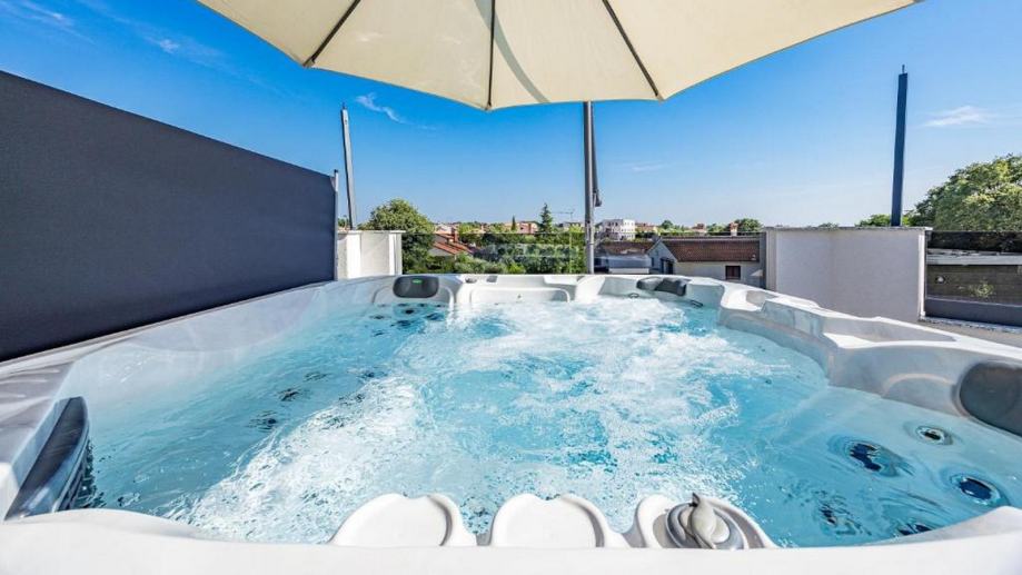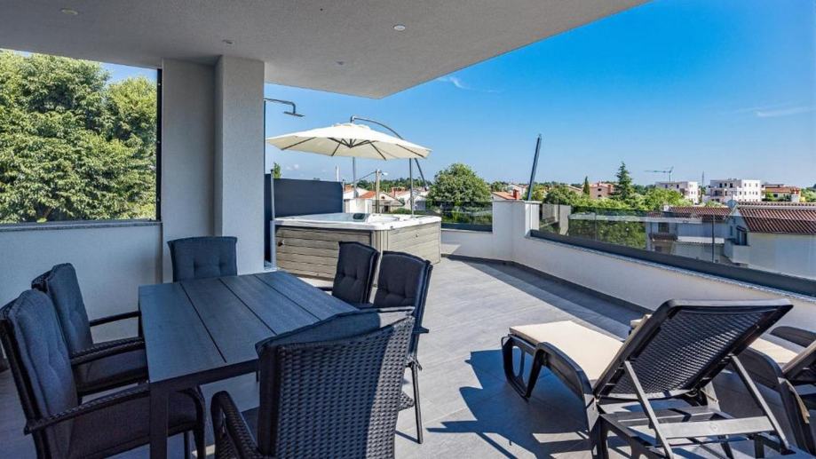 Do prostrane terase (30 m2) se dolazi izlazom krov veliku staklenu stijenu gdje se nalazi jacuzzi i sauna koje upotpunjuju savršenstvo ovoga stana te imamo prekrasan pogled.