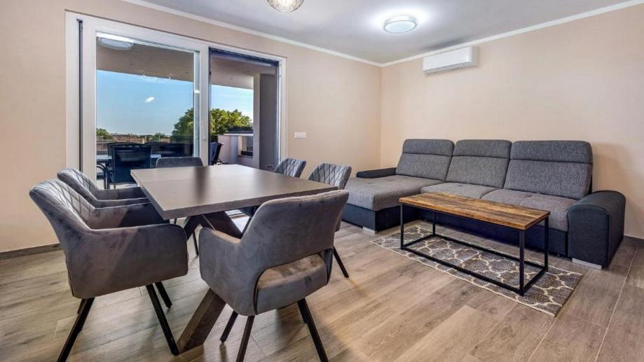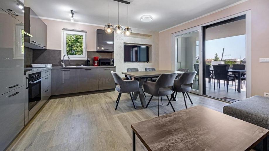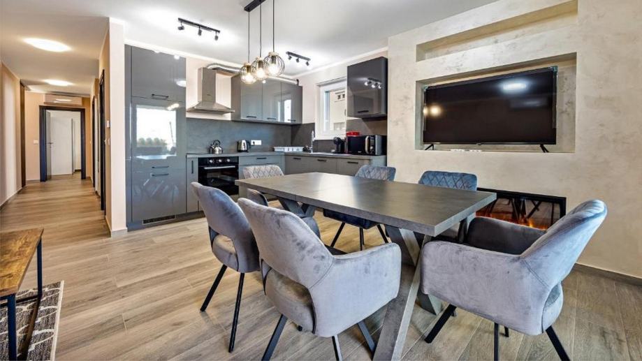 Ulazom u stan dolazimo u hodnik koji je direktno povezno s dnevnim boravkom s open space dizajnom. Ovdje je kuhinja, zatim prostrana blagovaonica, te komotan dnevni boravak.
