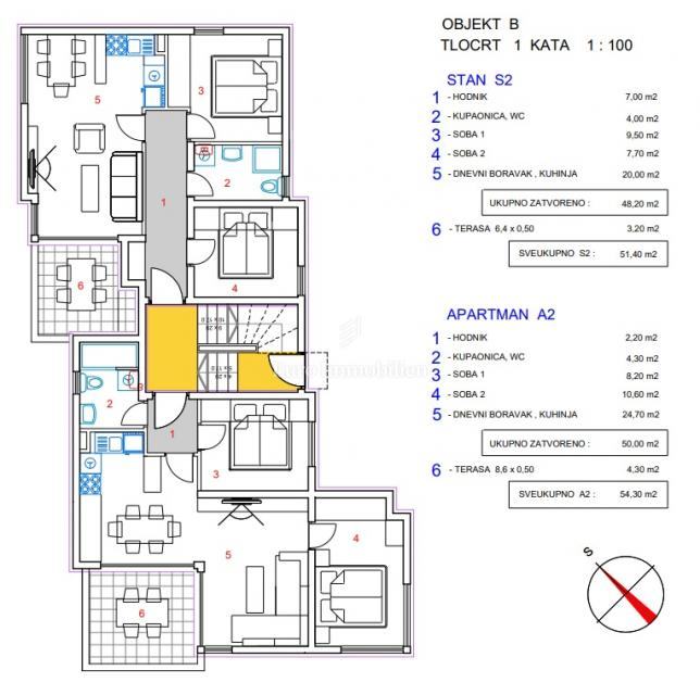 Prodaje se dvosobni stan S2 (objekt B) obračunske površine 51,40 m², smješten na 1. katu novogradnje, na izuzetnoj lokaciji – drugi red do mora. Stan se sastoji od hodnika, dnevnog boravka s kuhinjom i blagovaonicom, dvije spavaće sobe, kupaonice s WC-om te terase s pogledom na more.