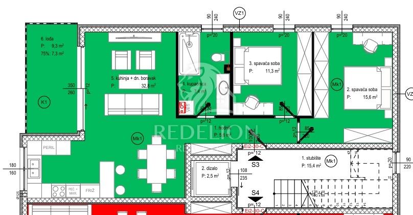 Stan S3 smješten je na prvom katu moderne zgrade s liftom, u privatnom naselju Crvene kuće. Nudi izvrstan raspored, visoku kvalitetu gradnje i mirno okruženje s privatnim pristupom samo za stanare.