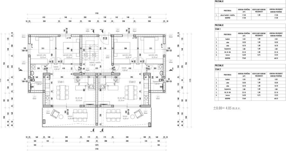 Ukupno je 6 stanova, svakom stanu pripada vanjsko parkirno mjesto, stanovi na drugom katu imaju krovne terase.