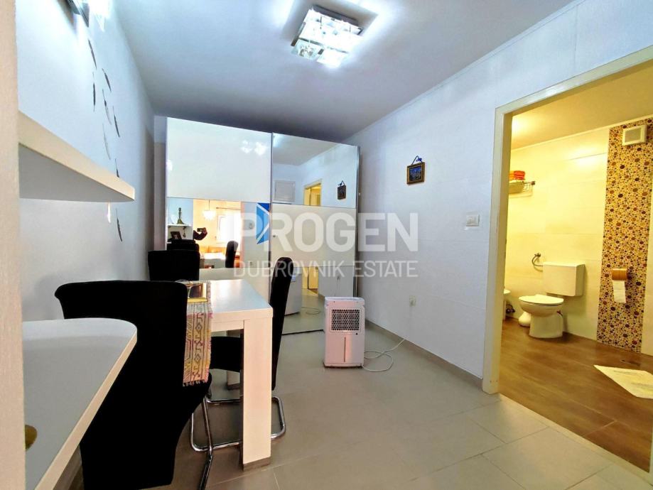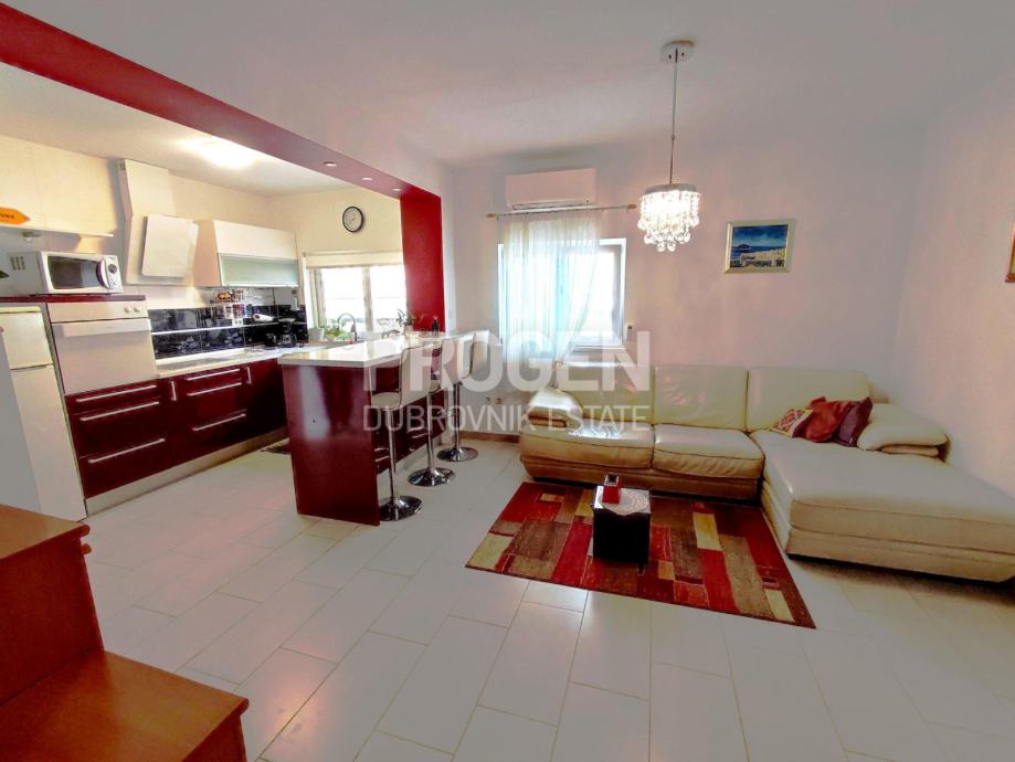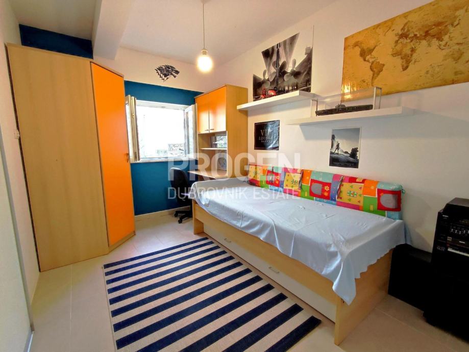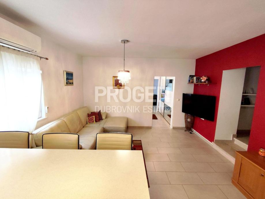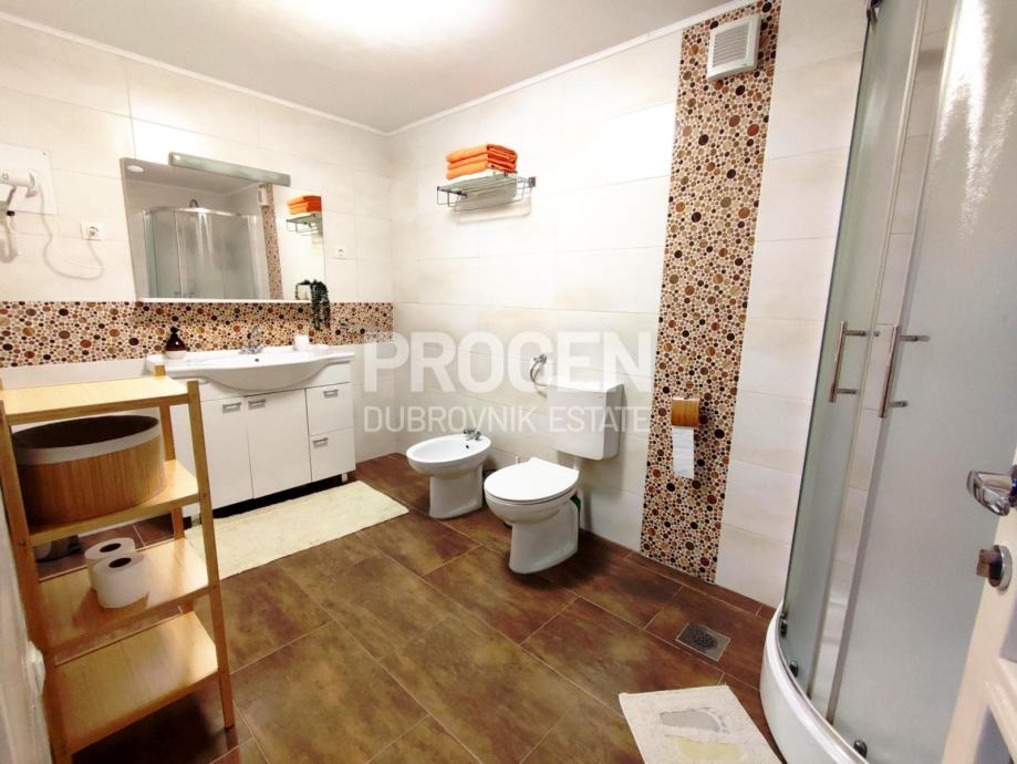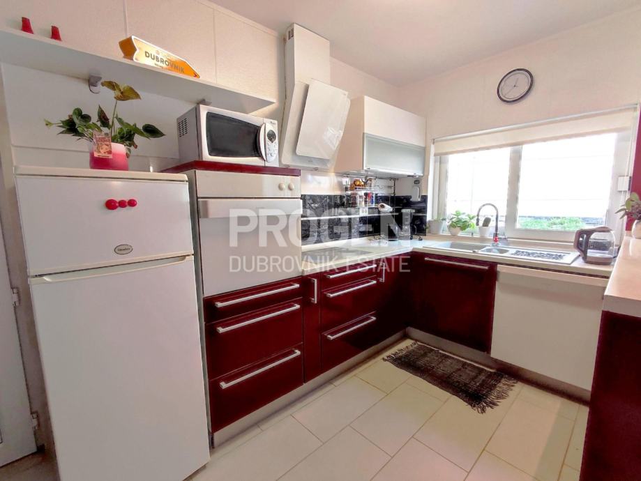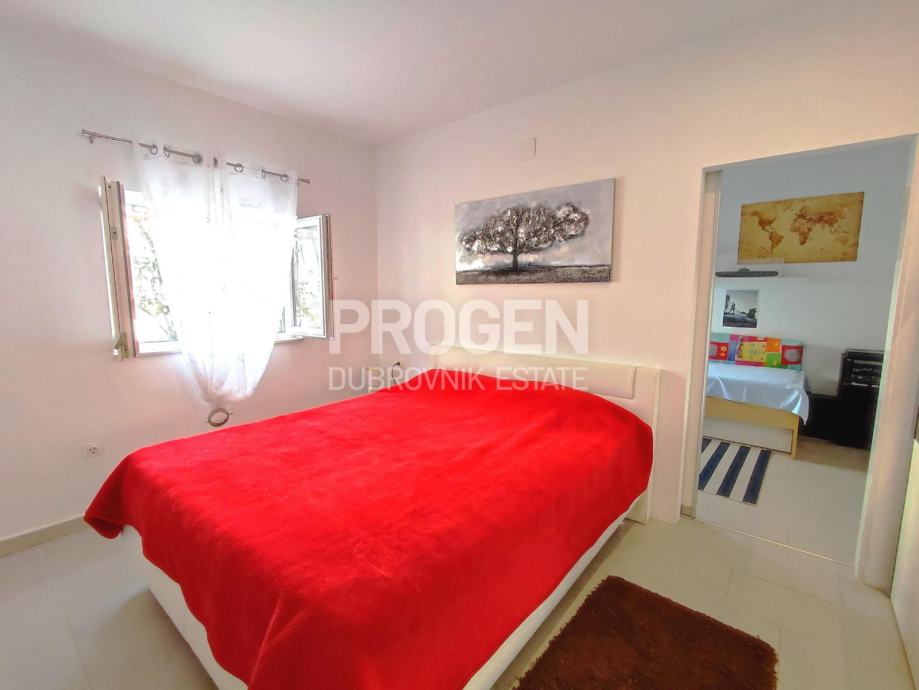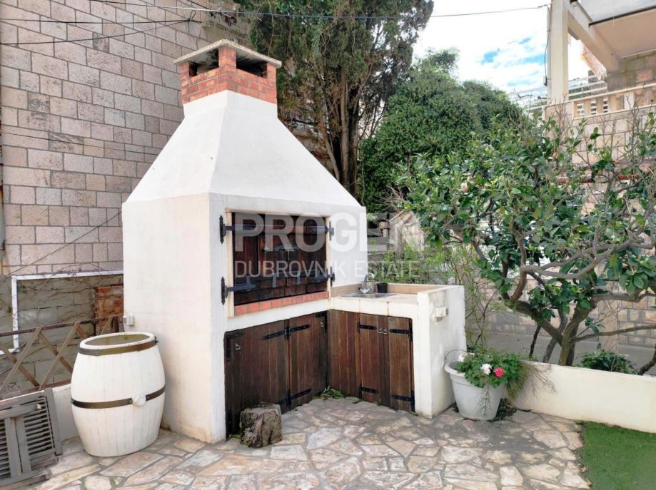 Uređen, namješten i odmah useljiv dvosobni stan koji zauzima cijele dvije etaže obiteljske kuće. Stan ima 63.11 m2 unutarnje neto stambene površine. Pripada mu teraca s vrtom, ukupne površine 140 m2, i ostave površine 6 m2. Na donjoj etaži u razini ulice je velika garaža sa sanitarnim čvorom, površine 51 m2. Nekretnina se nalazi na odličnom položaju u blizini mora, u mirnom dijelu grada.