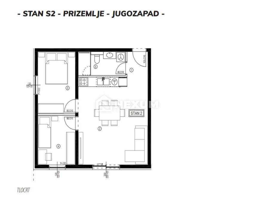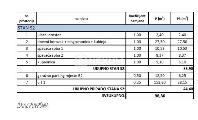 Stan ima ukupnu stambenu površinu od 53,90 m², a sastoji se od dnevnog boravka s kuhinjom i blagovaonicom, dvije spavaće sobe, kupaonice te ulaznog prostora. Posebna prednost ove nekretnine je prostrani privatni vrt površine 152,69 m², idealan za opuštanje, obiteljska druženja, dječju igru ili uređenje vrta prema vlastitim željama.