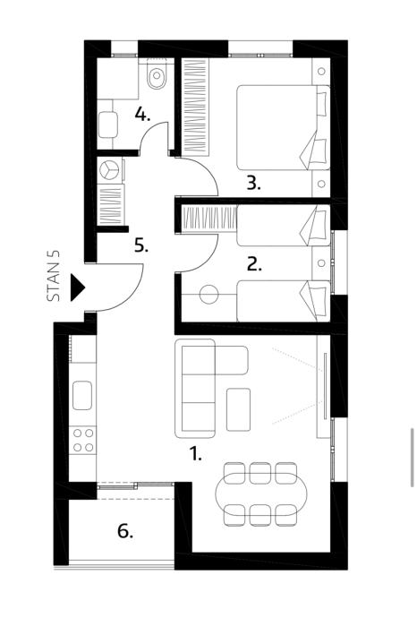 Stan S5 se nalazi na drugom katu, a sastoji se od hodnika, dnevnog boravka s kuhinjom i blagovaonicom, loggie, dvije spavaće sobe te kupaonice s WC-om.