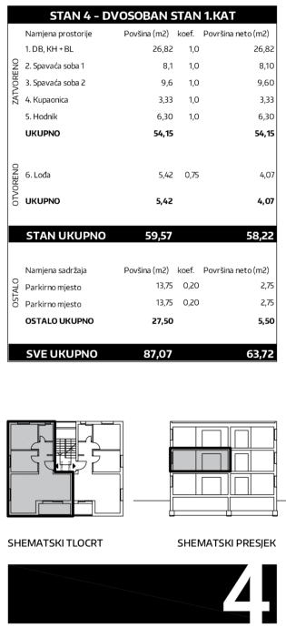 Stan S4 se nalazi na prvom katu, a sastoji se od hodnika, dnevnog boravka s kuhinjom i blagovaonicom, loggie, dvije spavaće sobe te kupaonice s WC-om.