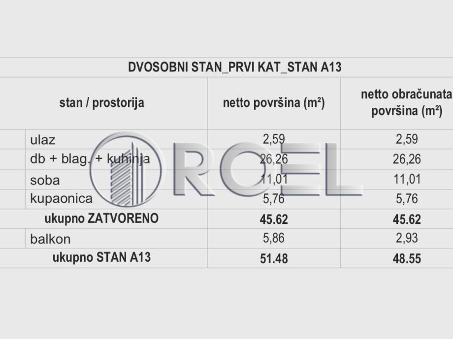 Moderan dvosobni stan ( A23 i B16) nalazi se na prvom katu novogradnje od ukupno tri kata u Stenjevcu, NKP 52,87 m2. Sastoji se od ulaza, dnevnog boravka s kuhinjom i blagovaonom s izlazom na balkon veličine, spavaće sobe te kupaonice s wc-om. Uz stan dolazi spremište površine 3,46m2. Pod je obložen parketom i keramikom. U stanu je podno grijanje. Uz stan dolazi spremište površine 4m2 i GPM površine 17,40m2 ( 8,7m2).