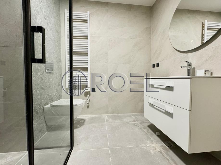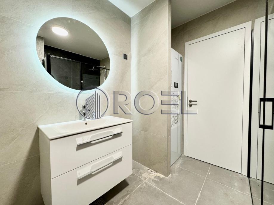 Kupaonica ima već ugrađeni umivaonik i ogledalo te ostale sanitarije ronomiranih proizvođača, a dizalice topline smještene su u ugradbenim ormarima u hodniku s ogledalom koji tkđ. dolaze uz stan.
