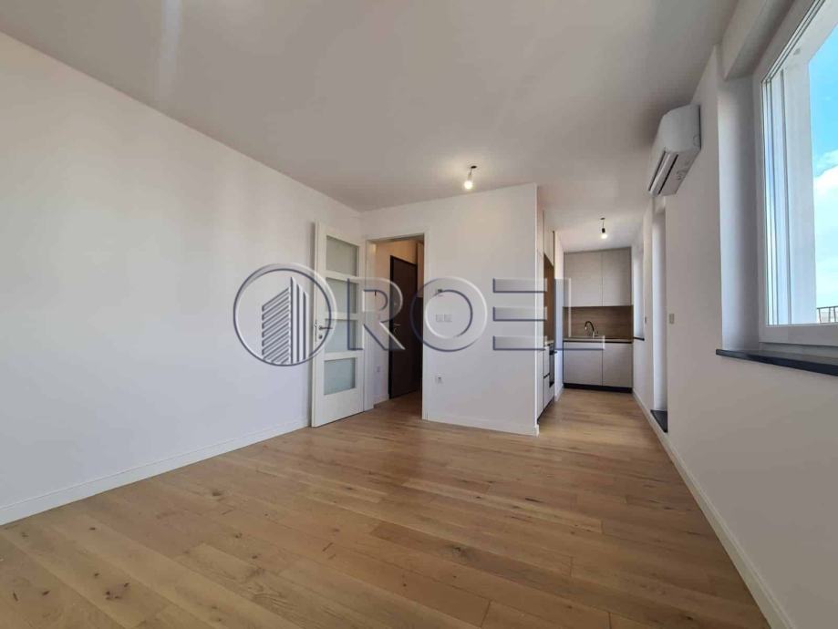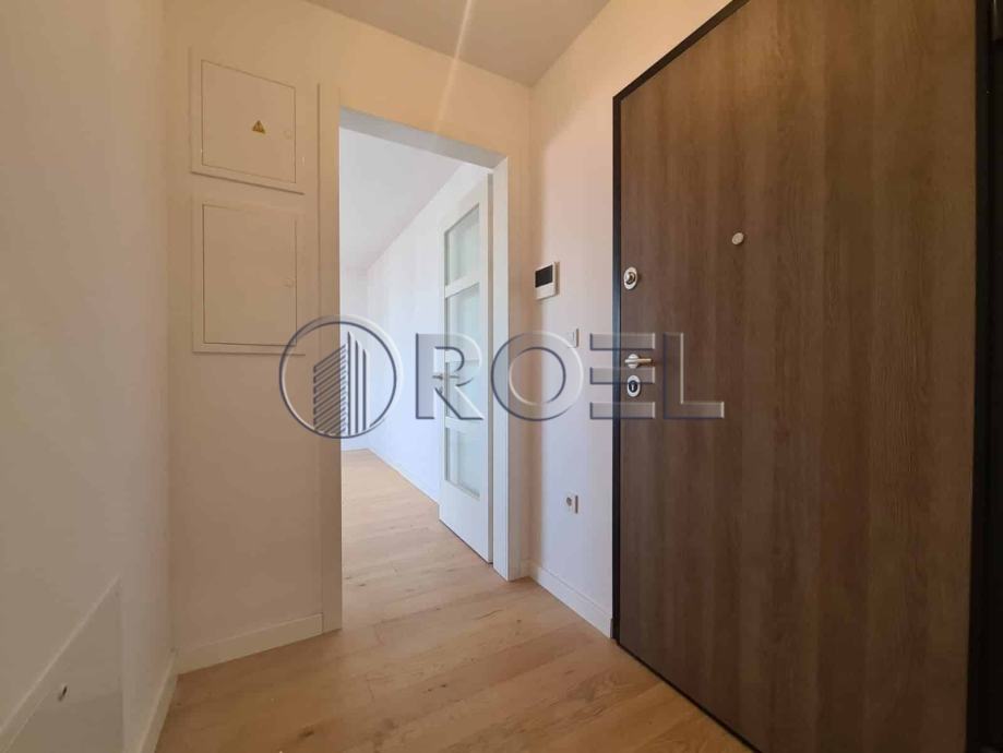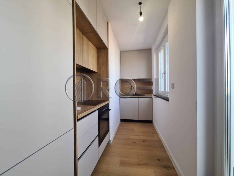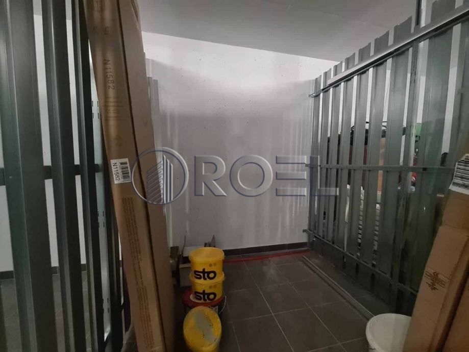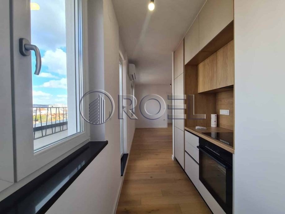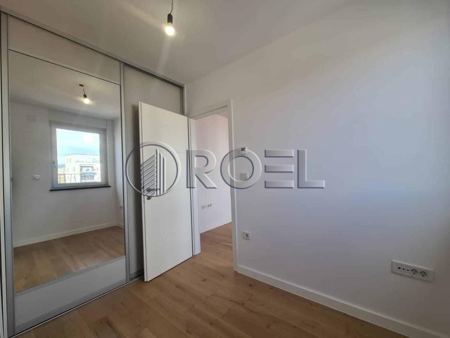 Dvosobni stan na petom katu nove zgrade s liftom u mirnoj ulici u Španskom, NKP 36 m2. Sastoji se od hodnika, kupaonice s wc-om, spavaće sobe, kuhinje i dnevnog boravka i blagovaonice s izlazom na terasu. Stan je orijentiran na sjever. Stan nije kompletno opremljen. U stanu je nova kuhinja, ugradbeni ormari i sanitarije. Pod u stanu je obložen parketom i keramikom. Grijanje u stanu je podno. Stanu pripada i spremište i vlastito garažno parkirno mjesto na -1.