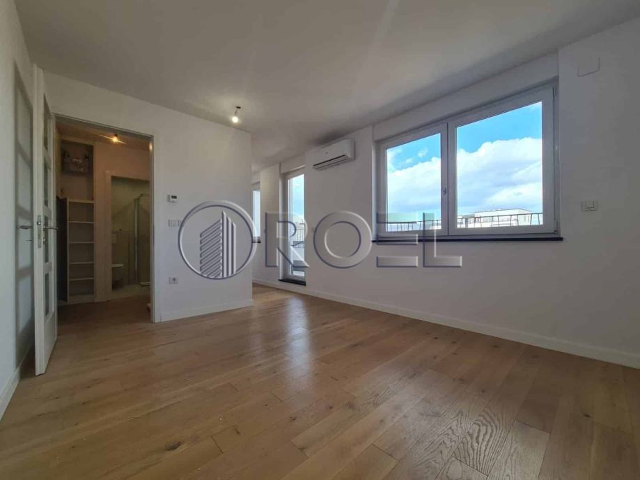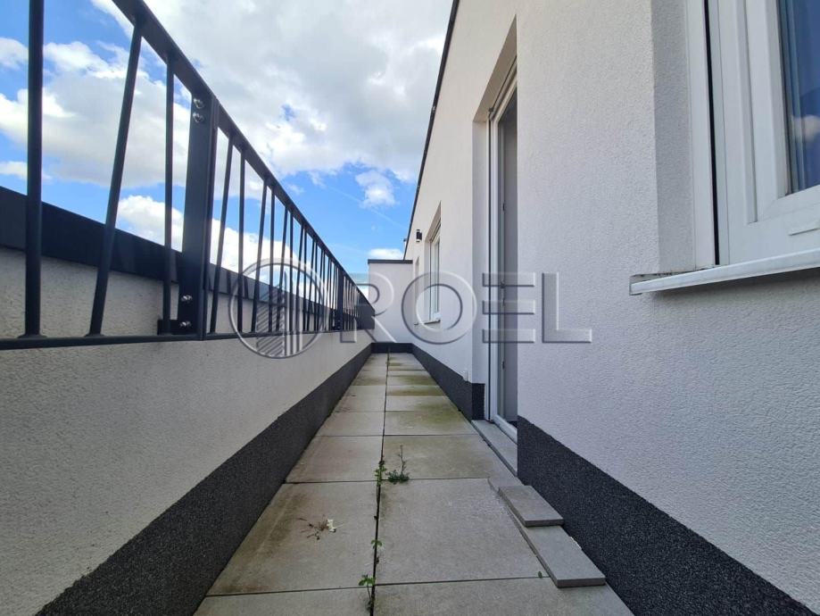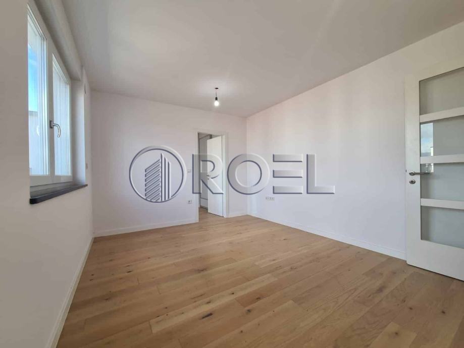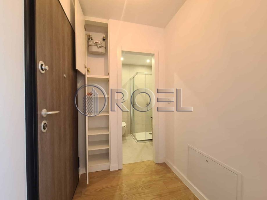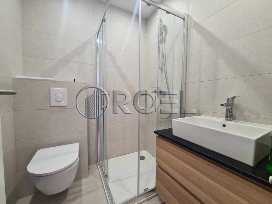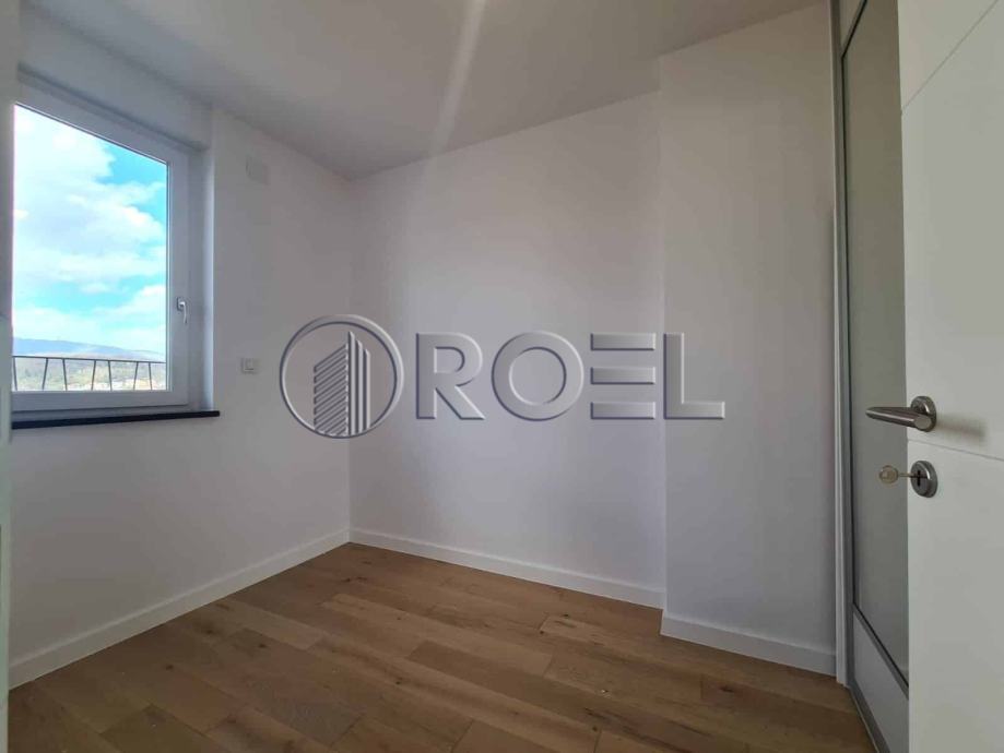 Dvosobni stan na petom katu nove zgrade s liftom u mirnoj ulici u Španskom, NKP 36 m2. Sastoji se od hodnika, kupaonice s wc-om, spavaće sobe, kuhinje i dnevnog boravka i blagovaonice s izlazom na terasu. Stan je orijentiran na sjever. Stan nije kompletno opremljen. U stanu je nova kuhinja, ugradbeni ormari i sanitarije. Pod u stanu je obložen parketom i keramikom. Grijanje u stanu je podno. Stanu pripada i spremište i vlastito garažno parkirno mjesto na -1.