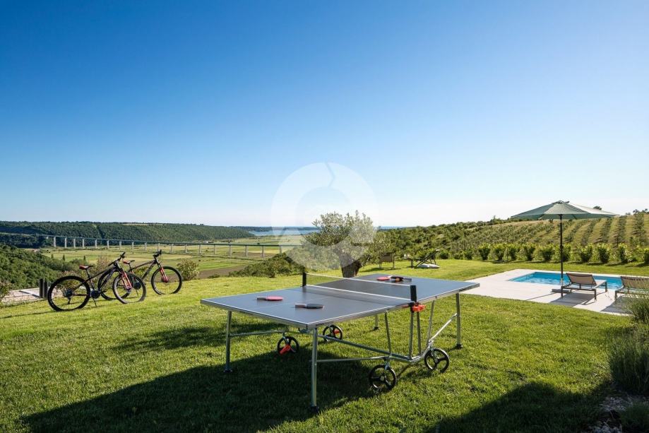 Bazen površine 44 m2 grijan je i ima sistem elektrolize. Uz bazen nalazi se ljetna kuhinja, vanjski tuš i wellnes prostor.
