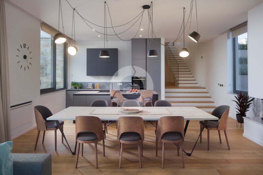 Dnevni boravak se nastavlja u vanjski prostor s velikom natkrivenom terasom i stepenicama koje se spuštaju prema bazenu s pogledom na maslinike, vinograde i more.