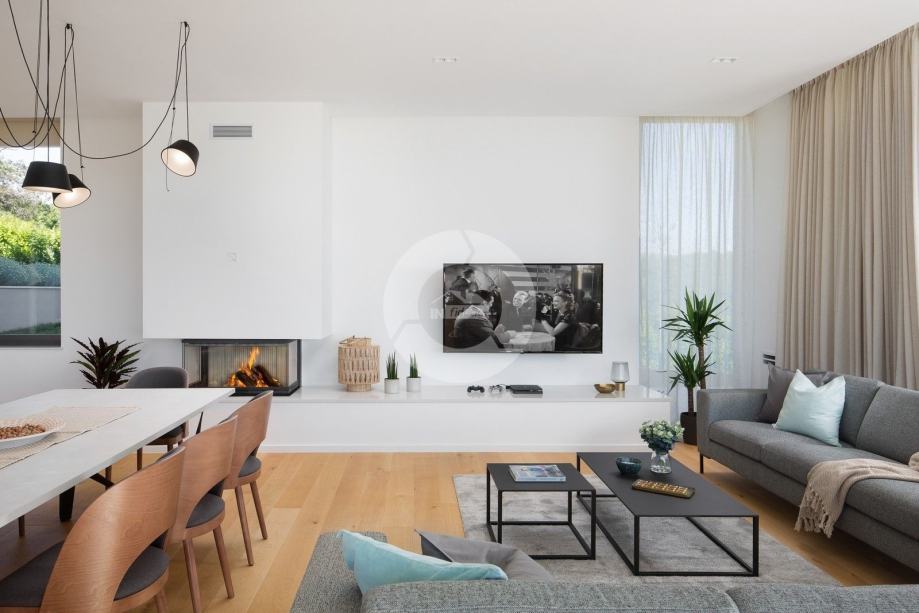 Posebnost unutarnjeg prostora čini uređenje koje kombinira prirodne materijale (drveni podovni, kameni detalji) i boje te kamin za grijanje i ugođaj.