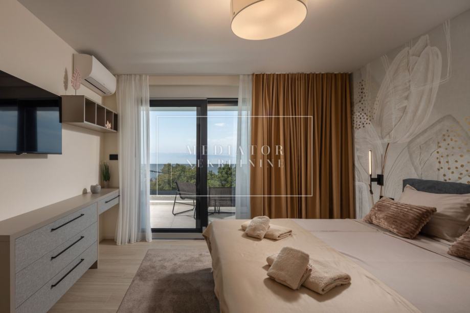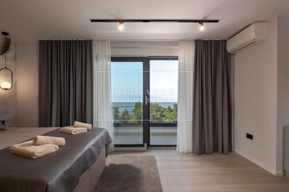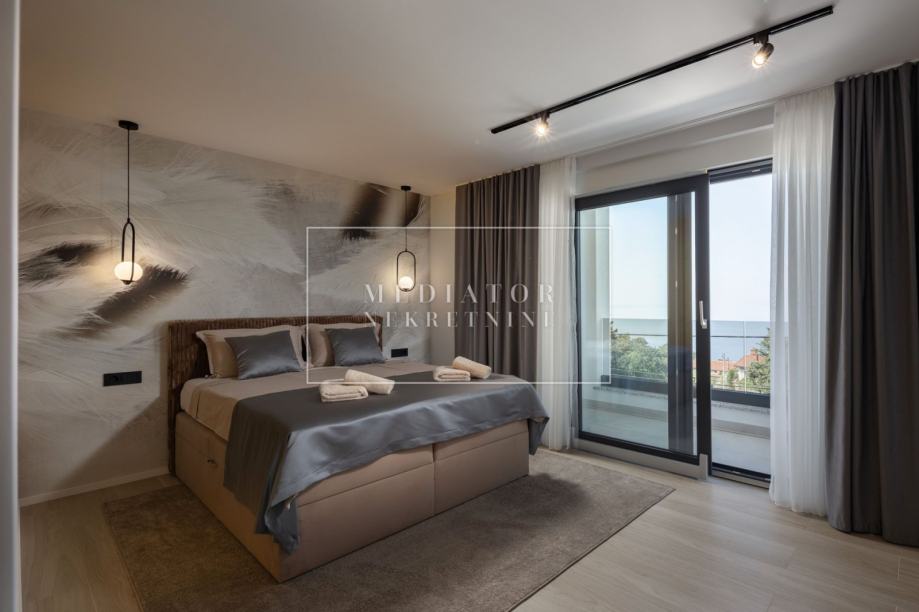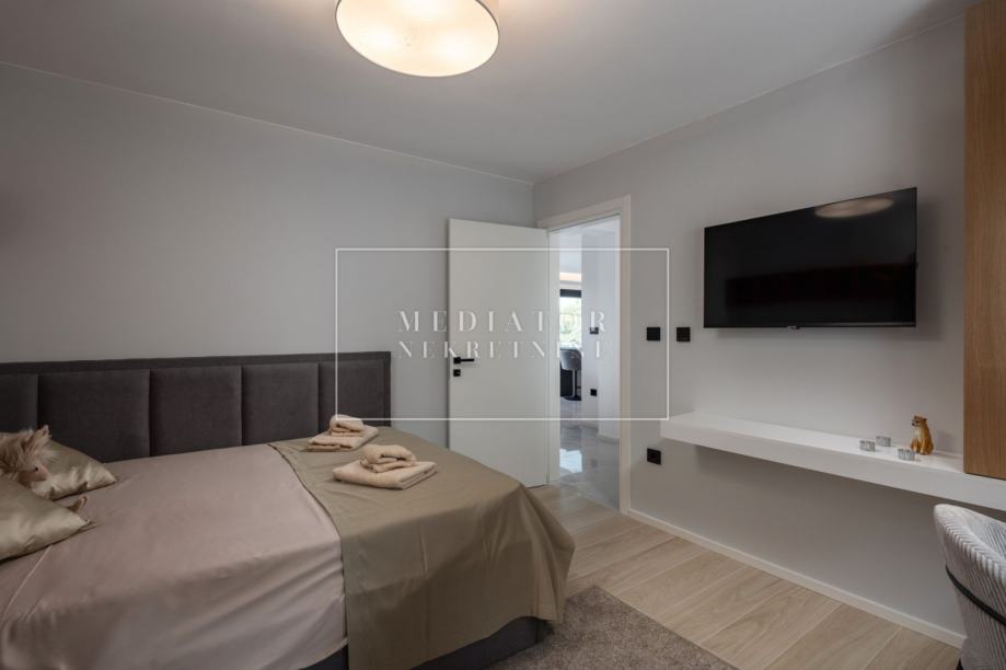 Na gornjoj etaži nalaze se tri spavaće sobe, svaka pažljivo uređena i opremljena za maksimalnu udobnost. Master spavaća soba ima vlastitu garderobu i kupaonicu, dok dodatne sobe dijele treću, moderno uređenu kupaonicu. S kata se također izlazi na još jednu natkrivenu terasu s djelomičnim pogledom na more.