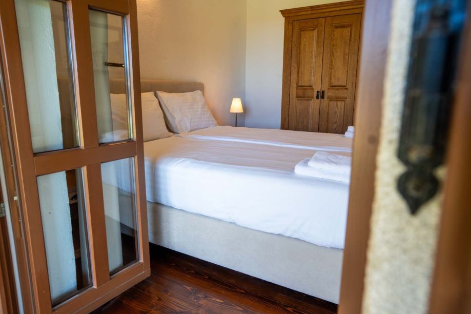 Vila se sastoji od prizemlja i kata, a interijer je opremljen rustikalno dizajniranim namještajem izrađenim od hrasta. Prostor dnevnog boravka s kaminom obloženim dekorativnim kamenom povezan je sa sobom za zabavu, koja uključuje biljarski stol – idealno za opuštanje i druženje.