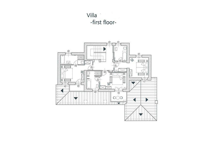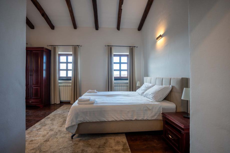 U prizemlju se nalazi jedna spavaća soba s vlastitom kupaonicom i izlazom na terasu, dok se na katu nalaze tri dodatne spavaće sobe, svaka s vlastitom kupaonicom. Dvije sobe imaju i privatne balkone s pogledom na more.
