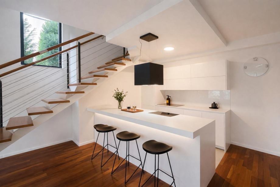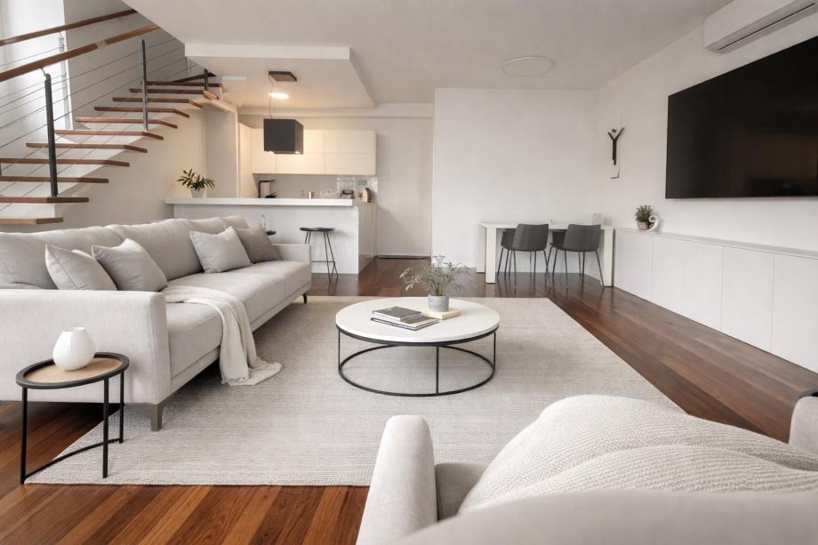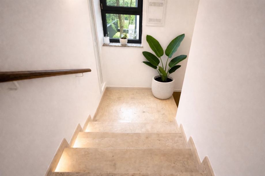 Nekretnina se prostire na dvije i pol etaže, s jasno odvojenim dnevnim i spavaćim zonama, obiljem prirodnog svjetla i iznimnim osjećajem prostora.