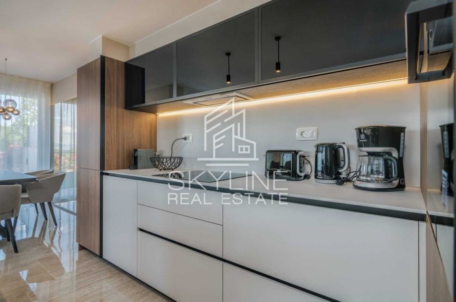 Kvalitetna gradnja i pažljivo odabrani materijali vidljivi su kroz PVC stolariju s komarnicima i električnim roletama, električno podno grijanje, dva klima uređaja te kombinaciju keramike i parketa, dok je namještaj rađen po mjeri i uključen u cijenu. Apartmanu pripadaju dva parkirna mjesta.