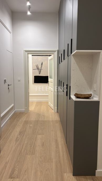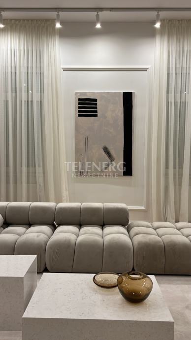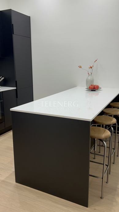 Namješten ugradbenim ormarima i kuhinjom po mjeri od visokokvalitetnih materijala te dizajnerskim namještajem.