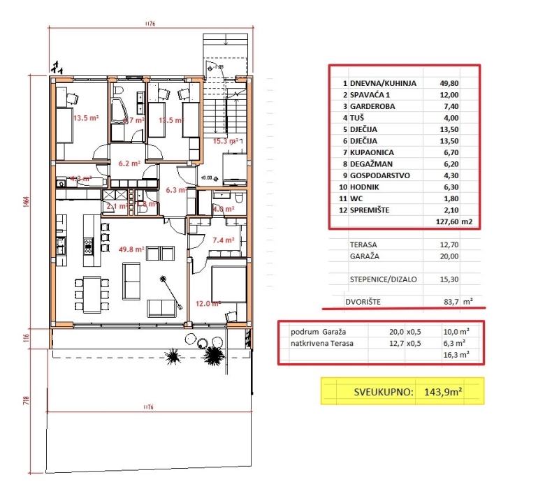 Sveukupne površine 143,90m2 na koju se obračunava cijena stana.