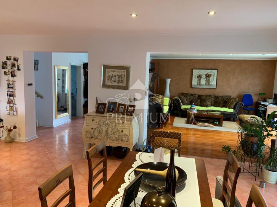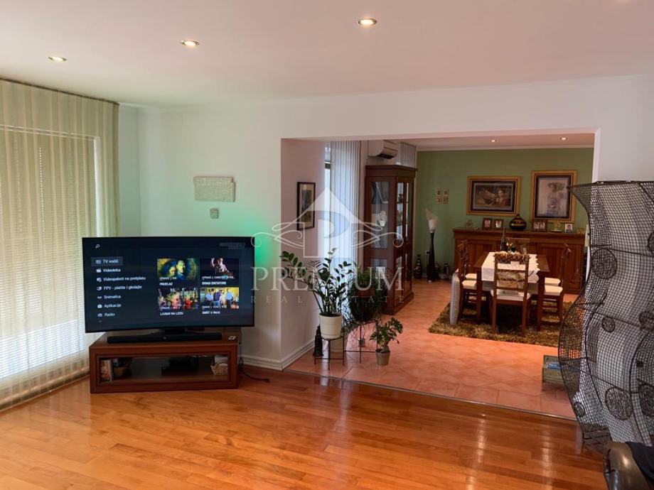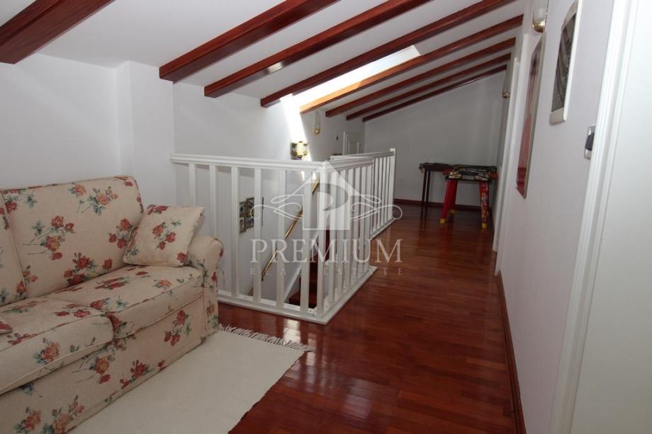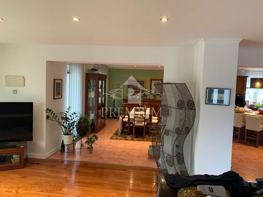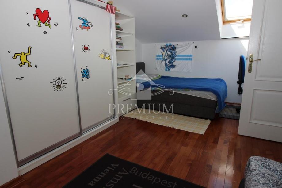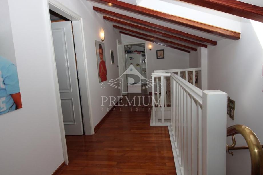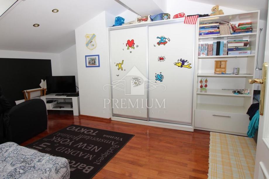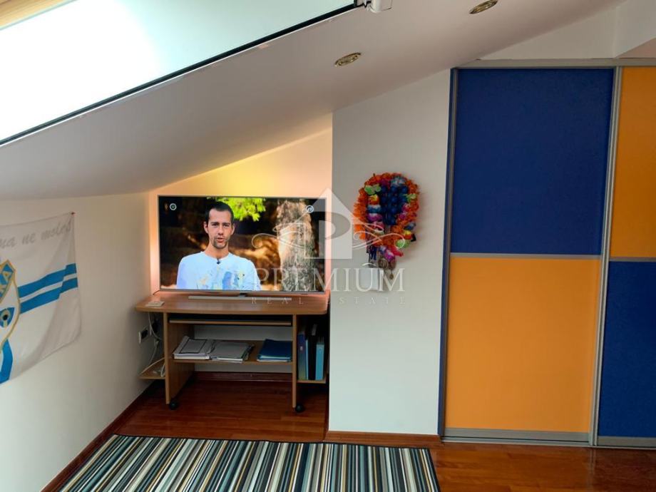 U ponudi imamo vrlo moderno opremljen dvoetažni četverosobni stan koji je smješten u maloj stambenoj zgradi na mirnoj i tihoj lokaciji. U vlasničkom listu površina stana iznosi 296,39 m2 a prema obračunu koeficijenta iznosi 235 m2. Donja etaža se sastoji od hodnika, prostranog dnevnog boravaka, blagovaone i kuhinje te dvije spavaće sobe, dvije velike kupaone, lođe i terase. Unutarnjim stubištem dolazi se na gornju etažu koja se sastoji od galerije te dvije spavaće (dječije) sobe i velike kupaone. Niži dio potkrovlja je iskorišten za velika spremišta.