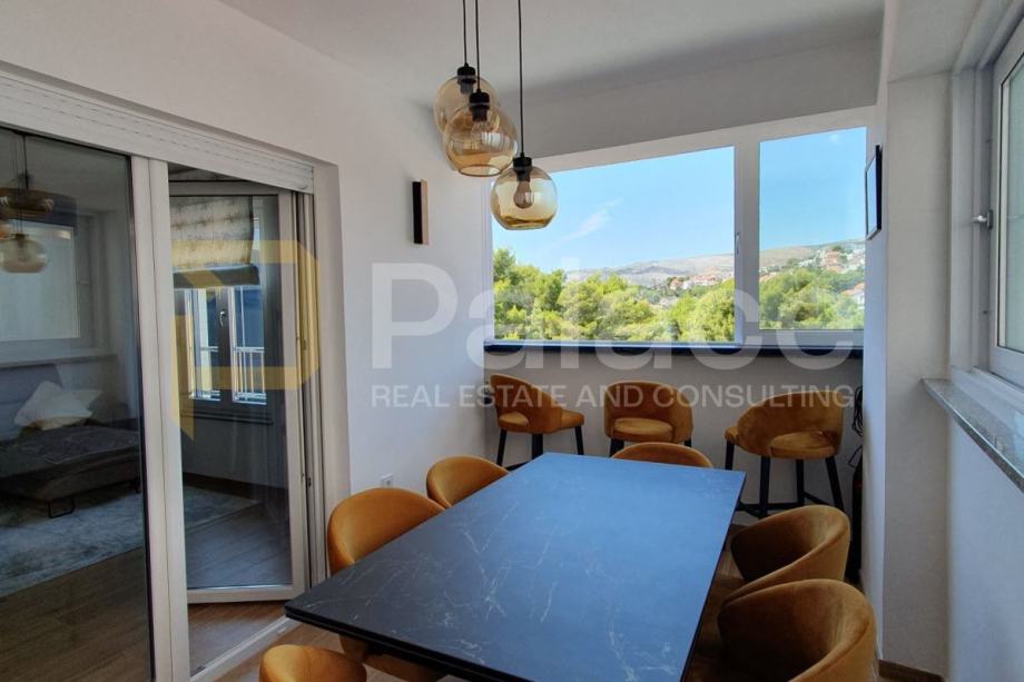 Stan je pažljivo uređen modernim materijalima i u potpunosti opremljen. Podno grijanje je ugrađeno u dnevnom boravku, kuhinji, kupaonici i na ulazu, dok su spavaće sobe obložene visokokvalitetnim lakiranim parketom. Lođa je ostakljena kliznim panelima, što omogućuje ugodan boravak i u produženoj sezoni, a s nje se pruža djelomičan pogled na more i zelenilo. U lođi je osigurano i mjesto za mini bar ili roštilj.