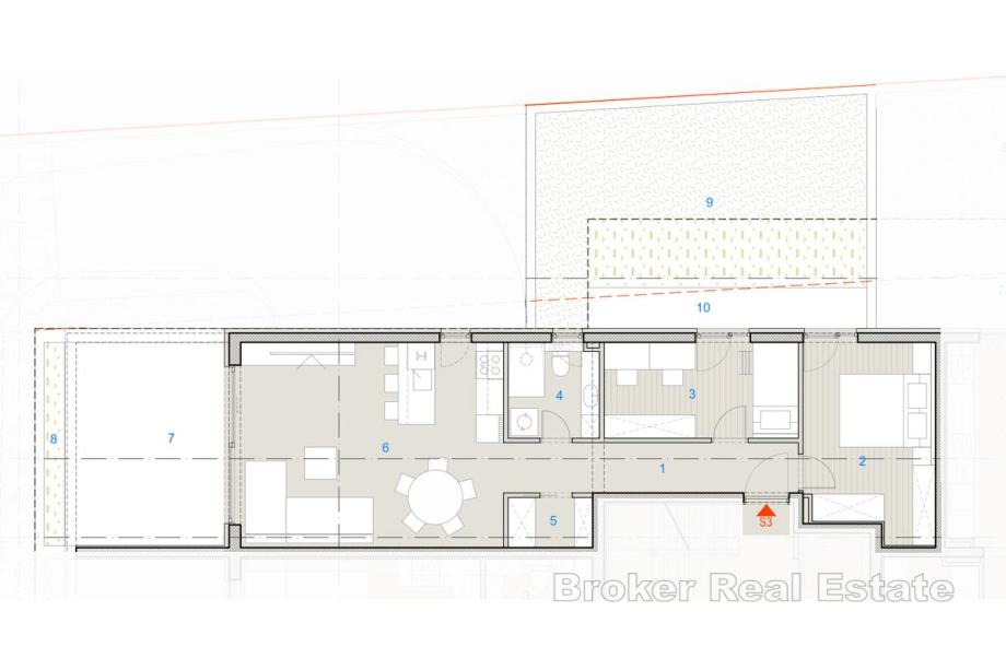 Tlocrtno je funkcionalno organiziran, s ulaznim prostorom i garderobom, dvije spavaće sobe, kupaonicom te otvorenim dnevnim prostorom koji objedinjuje kuhinju, blagovaonicu i dnevni boravak. Stan ima i natkrivenu terasu, dva pripadajuća vrta te popločane staze, što dodatno pridonosi dojmu životnog prostora s visokom dodanom vrijednošću.