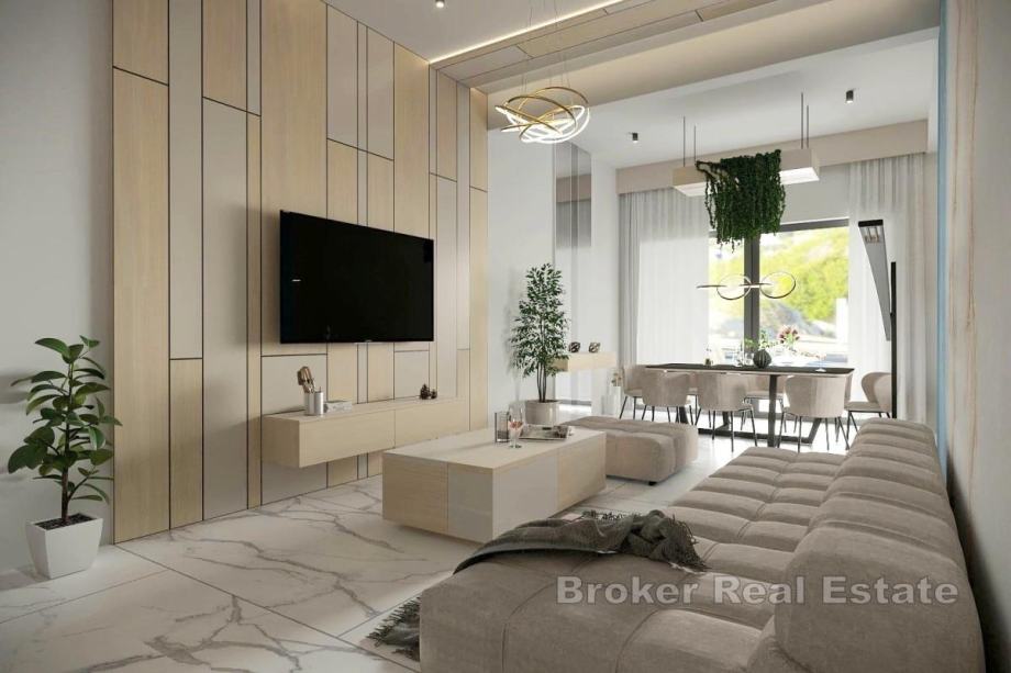 Neto stambena površina penthousea u novogradnji iznosi 195 m2 s pripadcima, te se sastoji od kuhinje, blagovaonice i dnevne sobe od zajedničkih prostorija, te tri spavaće sobe i tri kupaonice. Direktni izlaz iz dnevne sobe na terasu s bazenom pruža stambenom prostoru punu sunčevu svjetlost i izvrstan osjećaj povezanosti unutrašnjosti s vanjskim, a sve uz otvoreni pogled na more.
