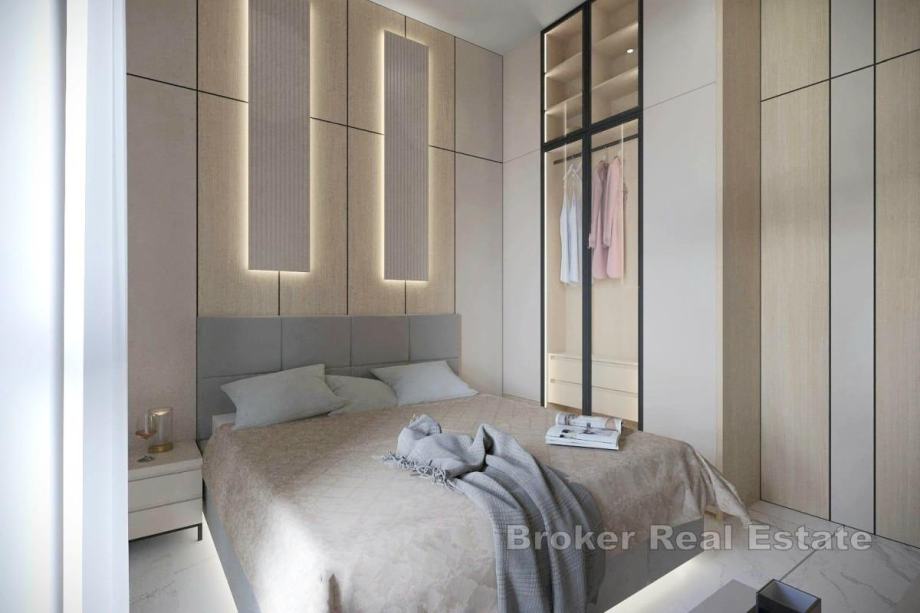 Unutarnje stubište vodi na krovnu terasu površine 144 m², na kojoj se nalazi privatni bazen – savršen prostor za uživanje s panoramskim pogledom na more. Stanu pripadaju dva vanjska parkirna mjesta. Stan odlikuje iznimna kvaliteta gradnje i opreme, s pažljivo odabranim materijalima i suvremenim tehničkim rješenjima koji osiguravaju visoku razinu udobnosti, funkcionalnosti i dugotrajnosti. Pri gradnji zgrade koriste se vrhunski materijali i oprema, uključujući dizajnersku keramiku i lift, što dodatno podiže razinu kvalitete i komfora stanovanja.